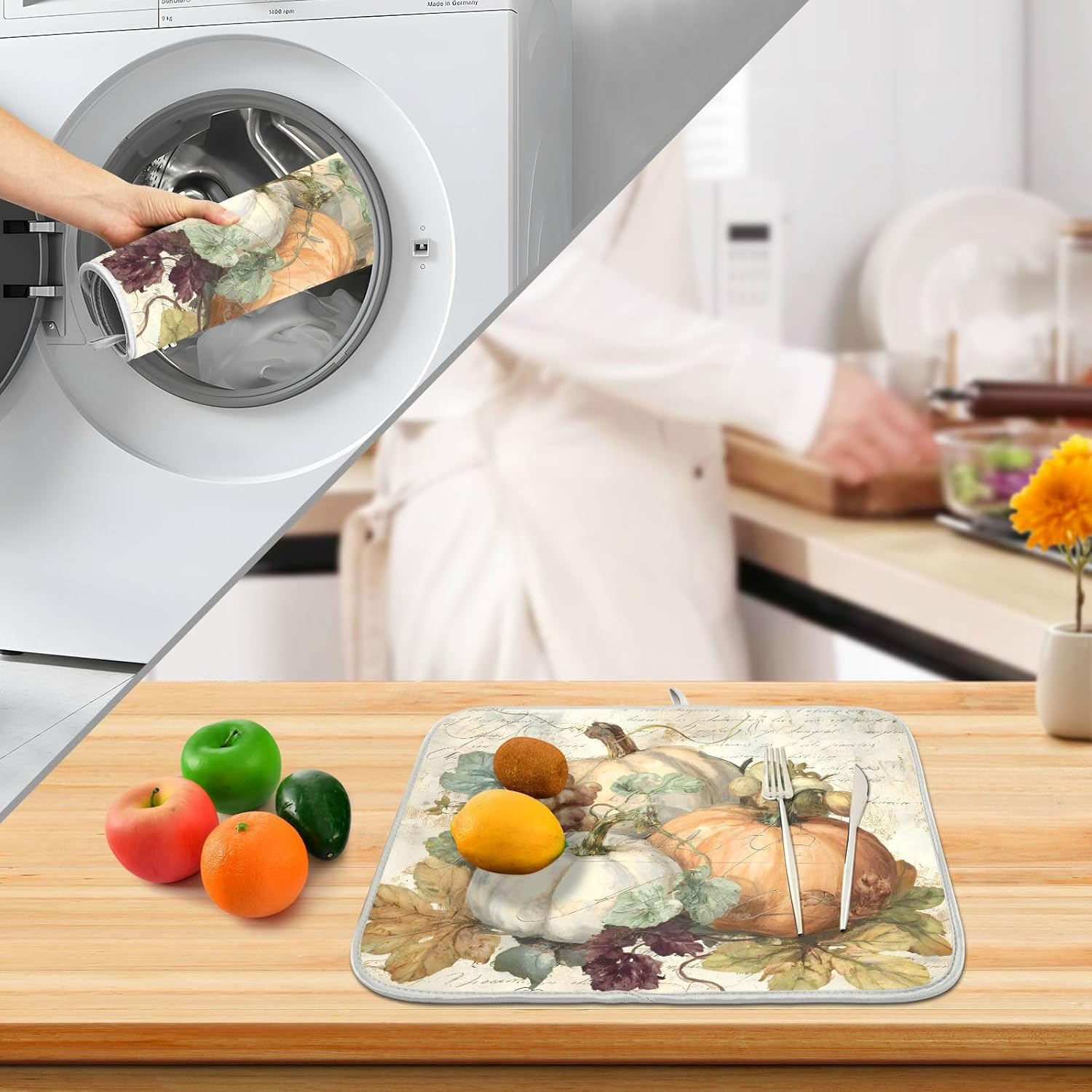 Autumn Pumpkin Fall Leaves Thanksgiving Dish Drying Mat for Kitchen Counter Absorbent Microfiber Small Drying Pad Dish mats for Kitchen Countertops 16 x 18 Inch