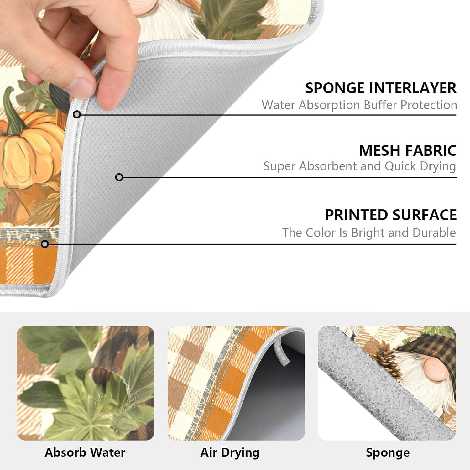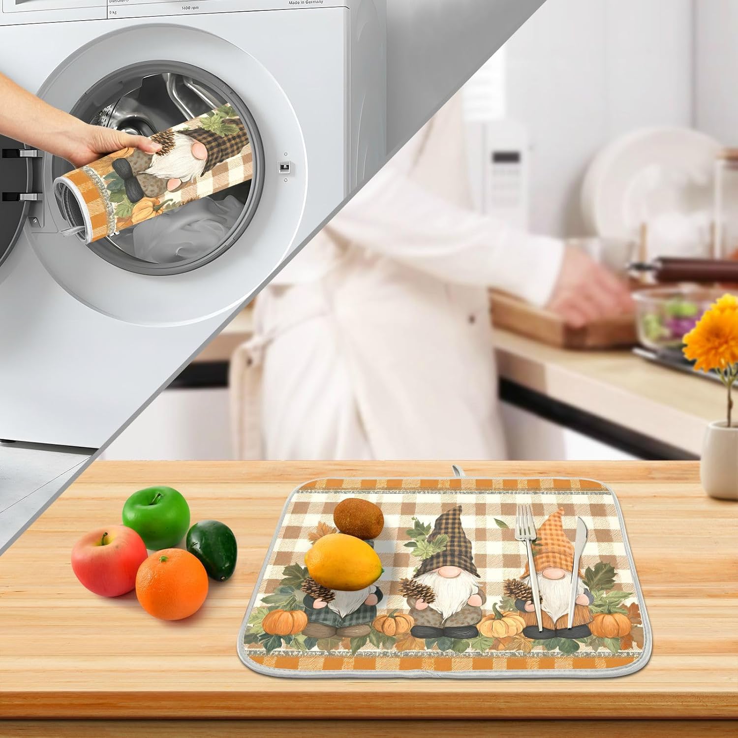 Fall Pumpkin Gnomes Maple Leaves Autumn2 Dish Drying Mat for Kitchen Counter Absorbent Microfiber Large Drying Pad Dish mats for Kitchen Countertops 18 x 24 Inch