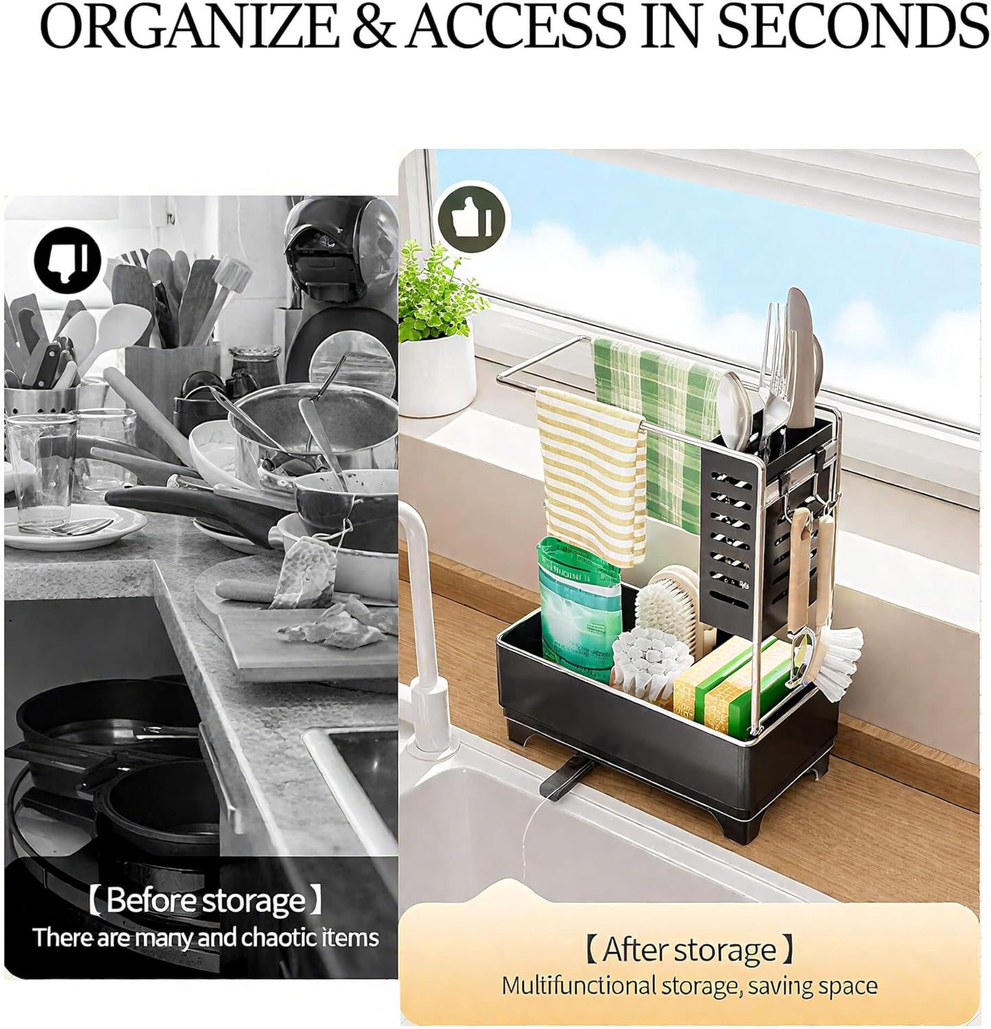 - Organize & Access in Seconds: This 2-tier sink caddy organizer maximizes vertical space to neatly hold dishcloths, sponges, brushes, scrapers or towels, and even small utensils with built-in hooks—keeping your kitchen sink area clutter-free. No more scattered cleaning tools; everything stays within arm’s reach while washing dishes