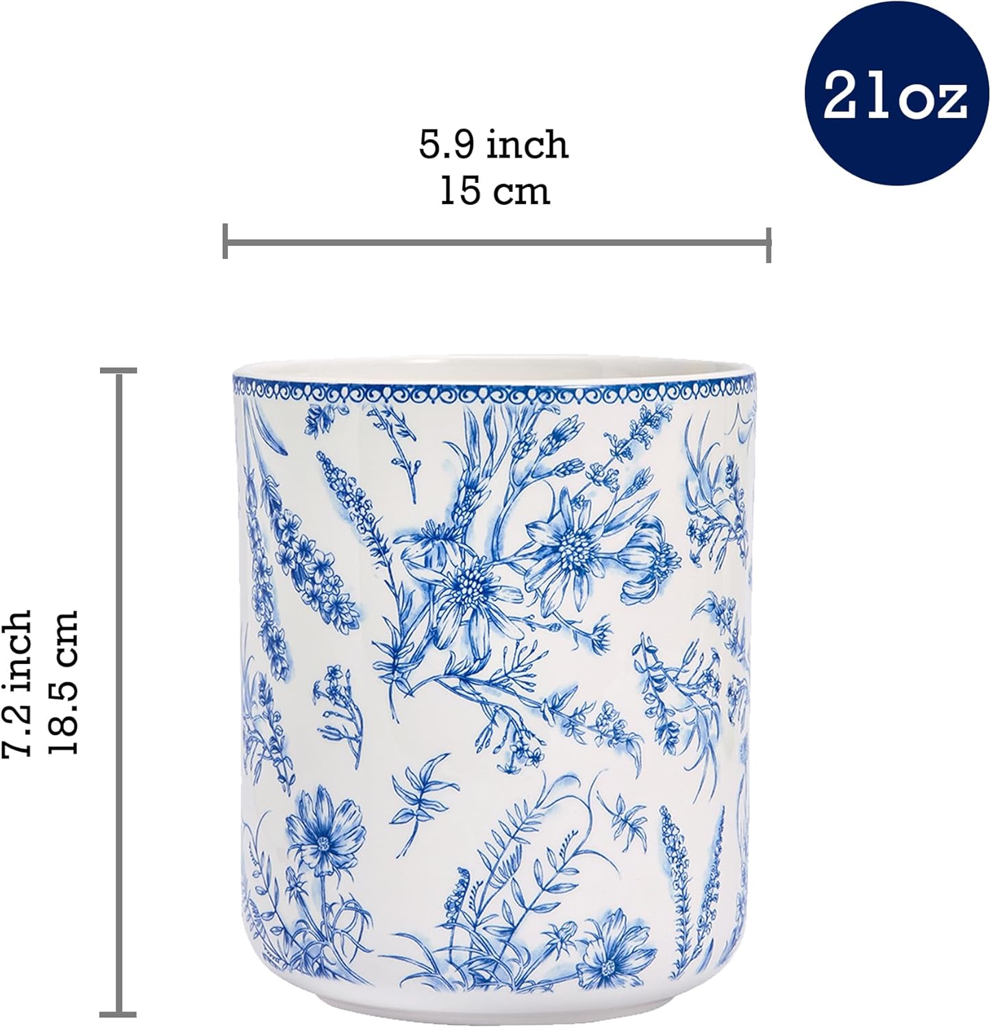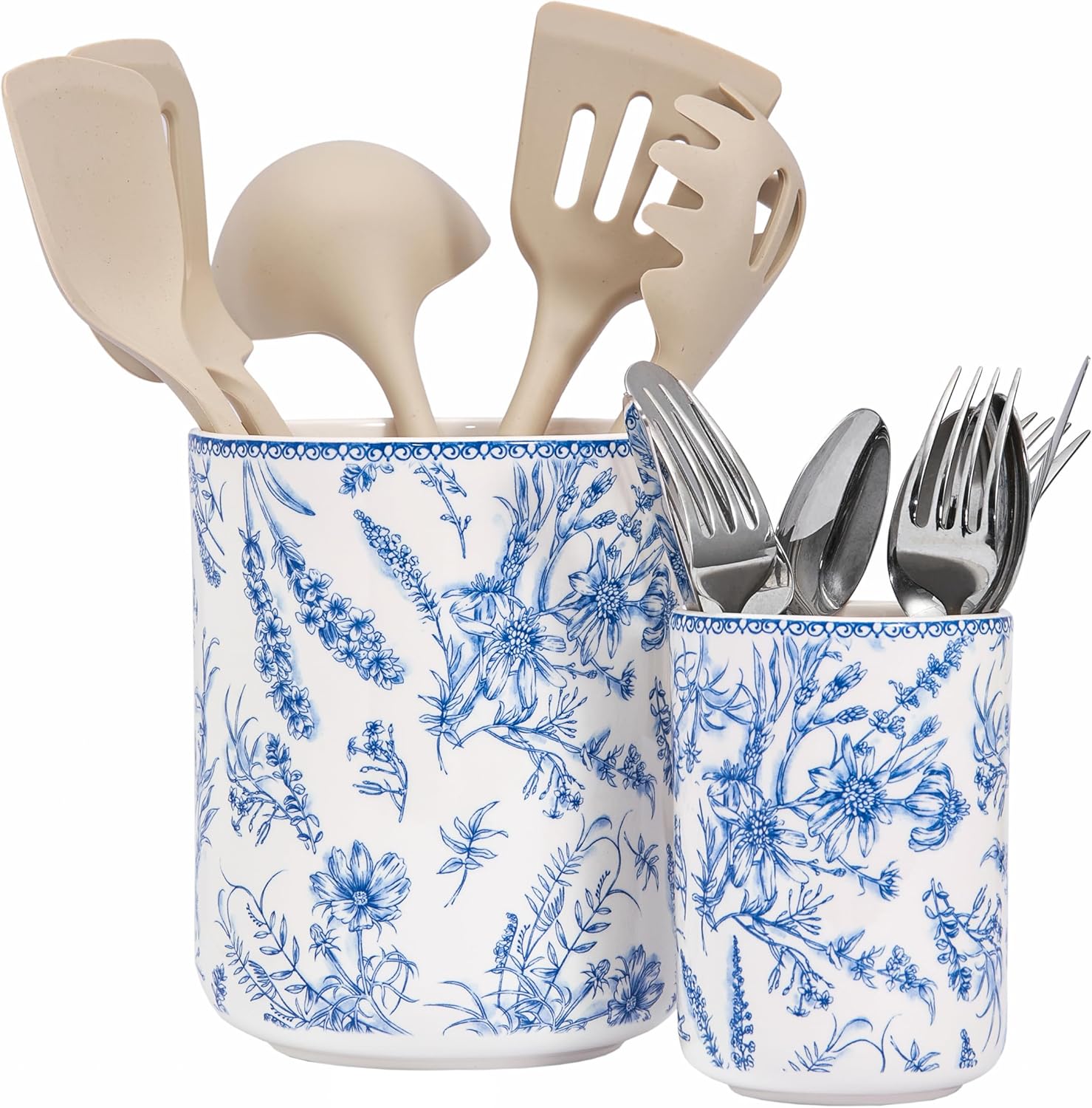 Bico Blue Garden Toile De Jouy Ceramic Utensil Holder Set of 2, Ceramic Kitchen Utensil Crocks for Countertop, Large Cooking Tool Holder Counter Decor, Spatula Organizer