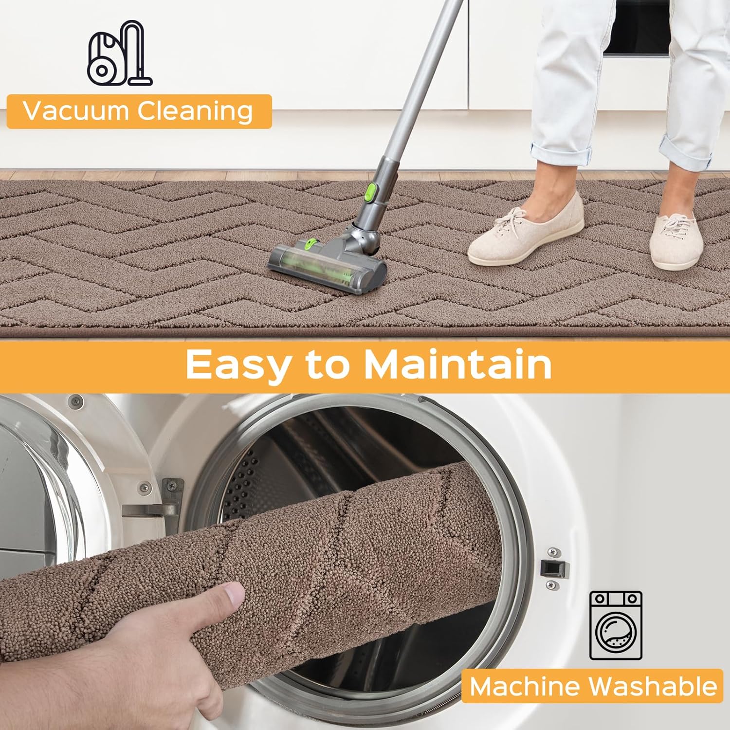 - [Easy Care & Waterproof Kitchen Floor Mat]: With countless polyester microfibers, our kitchen rugs effectively absorb spilled oil and water. The polyester washable carpet is designed to stand up to machine washing, it'll be easier to wash off the dirt.
