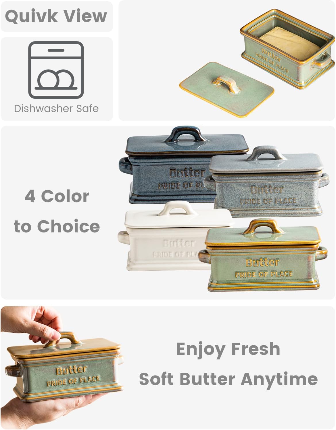 - Upgraded Lid: Unlike traditional wooden lids, this upgraded ceramic lid effectively keeps butter fresh. Built-in handles make lifting easy, combining practicality and elegance, perfect for everyday use