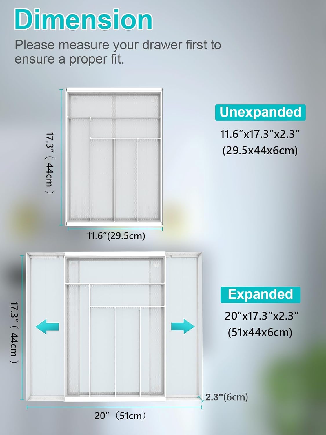 - Expandable Design: This Expandable Drawer Organizer Easily Adjusts From 5 to 7 Compartments, with a Width That Expands From 11.6" to 20". It Saves Space While Fitting All Your Kitchen Essentials with Ease.