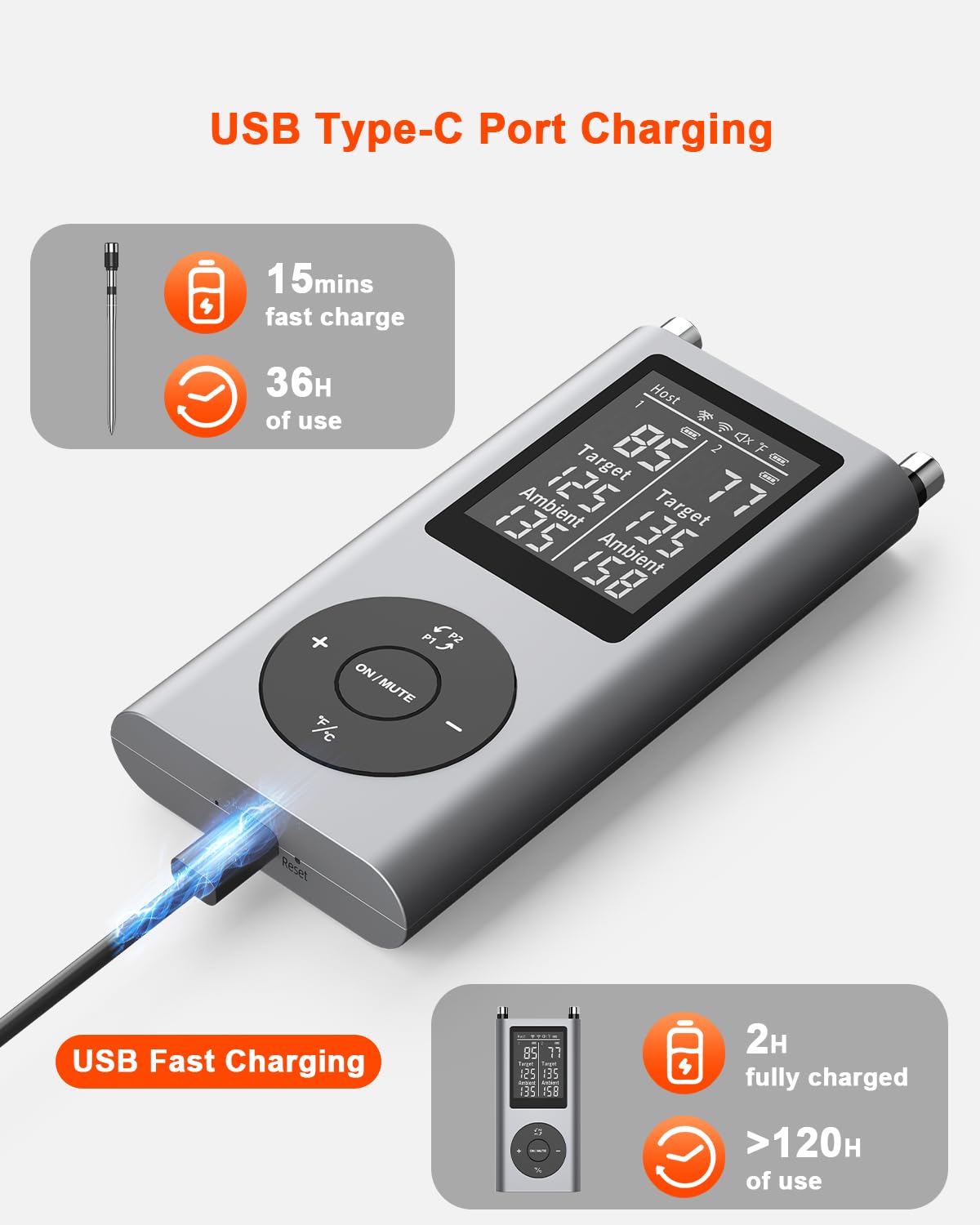 - 15-MIN FLASH CHARGE FOR 36-H USE: The 304 stainless steel probe charges in 15 mins for 36 hours of use, while the base The base fully charges in 2 hours for 120 hours of standby power— just fast, reliable performance (includes USB-C cable)