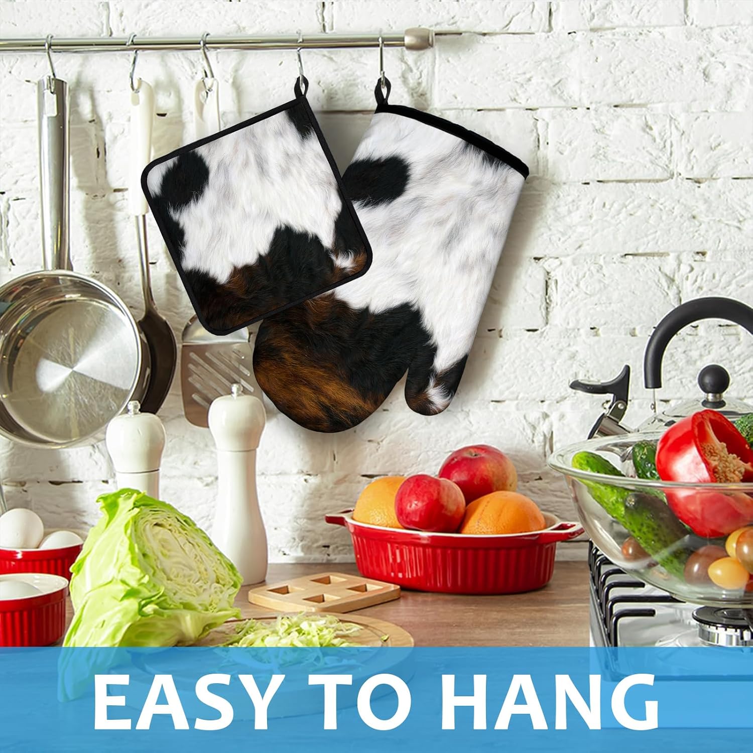 Brown Cowhide Oven Mitts and Pot Holders Sets Heat Resistant 4Pcs Potholders Oven Gloves Hot Pads for Kitchen Baking Cooking Grilling BBQ