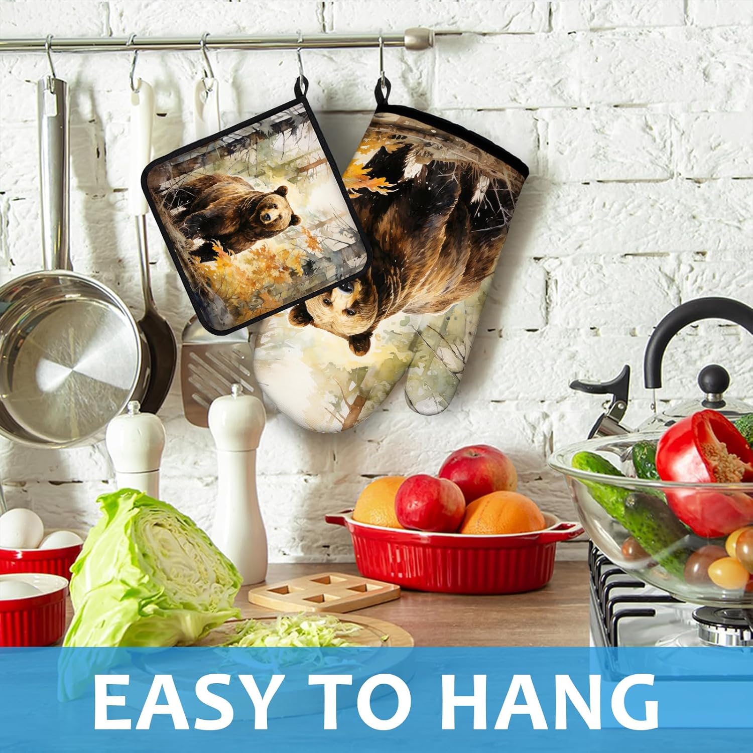 Watercolor Brown Bear Oven Mitts and Pot Holders Sets Heat Resistant 4Pcs Autumn Forest Animal Potholders Oven Gloves Hot Pads for Kitchen Baking Cooking Grilling BBQ