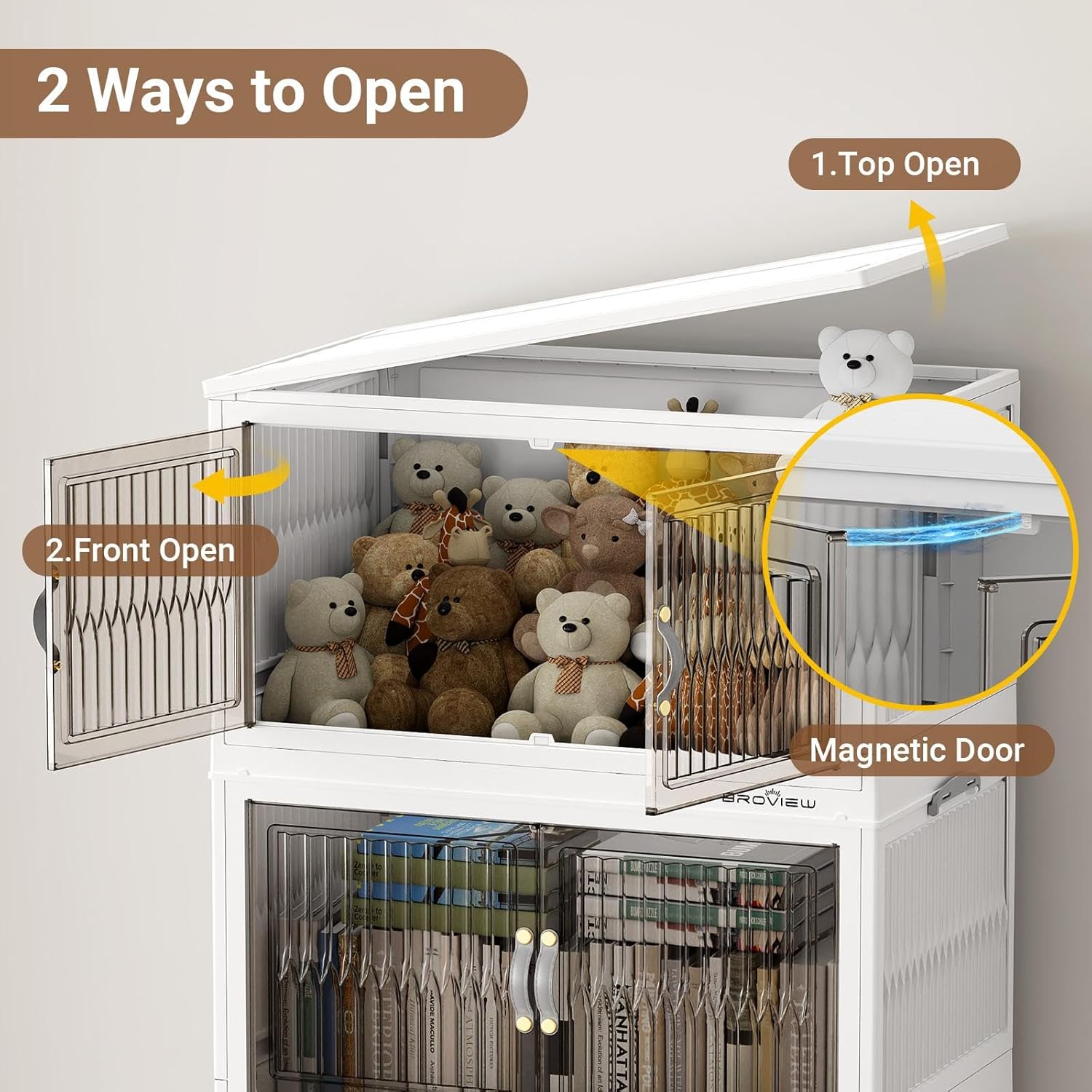 - 【Magnetic Front Open Doors & 4x Wheeled】The large storage bins with doors provide two options: front doors opening or top lid opening. The brown door can be easily seen through and with a magnetic device. The 4x 360-degree rotating wheels all have fixed functions and can be easily moved by releasing the valve, making them friendly to the elderly.