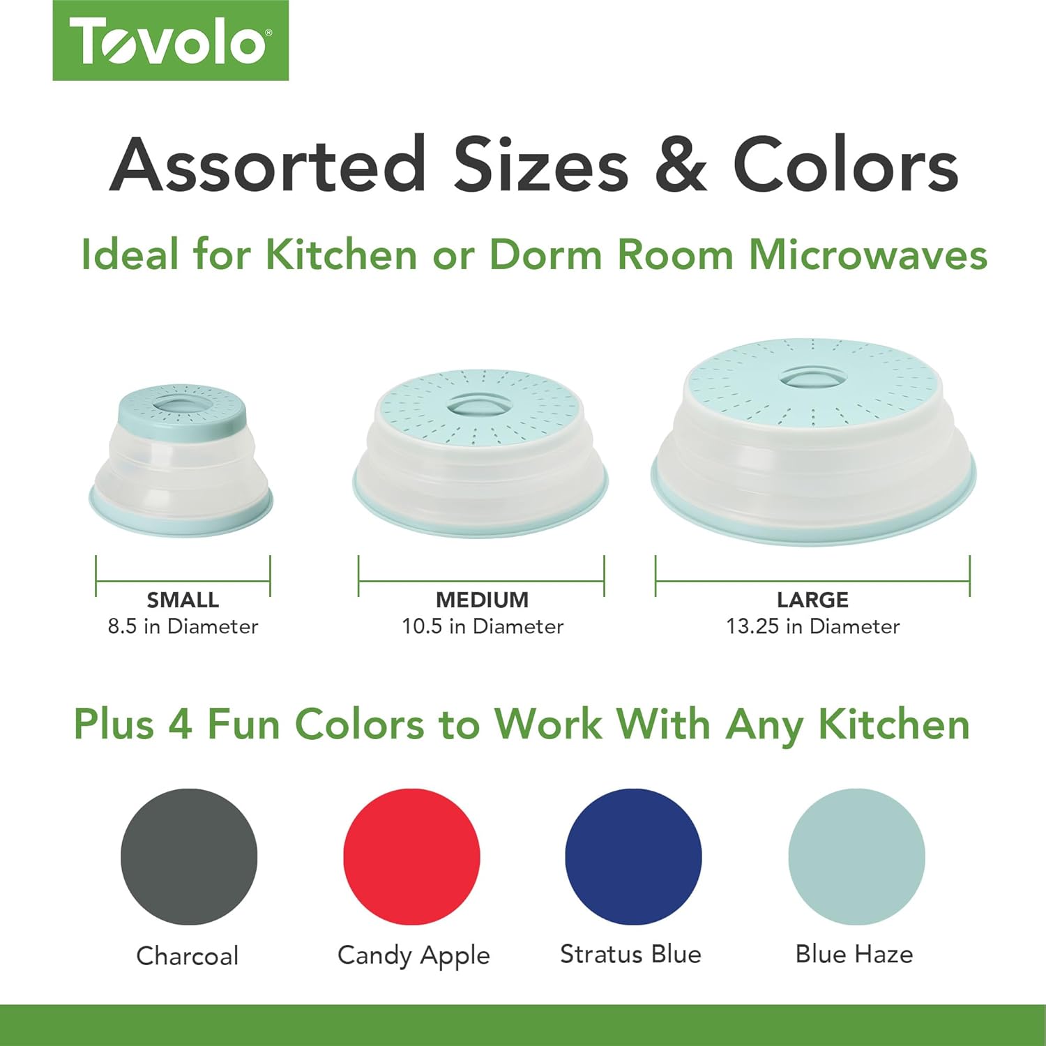 - Microwave Cover: The collapsible Tovolo Small Microwave Cover encourages even cooking & keeps your microwave clean with a vented lid. Measures 8.25"L X 8.5"W X 3”H. Interior is 10" diameter. Fits over small bowls and mugs.