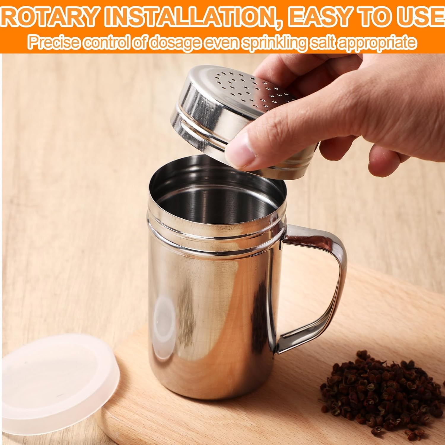 - Proper Size to Apply: the stainless steel dredge shakers with lid and handle are approx. 4.9 x 2.7 inches/ 12.5 x 6.8 cm and have a capacity of 14oz, The 14oz is the most common standard size for other spices, which avoids dust and water vapor from entering the bottle through the hole and keeps salt and pepper dry; The handles on one side help you to pick them up easily and make them more convenient to use