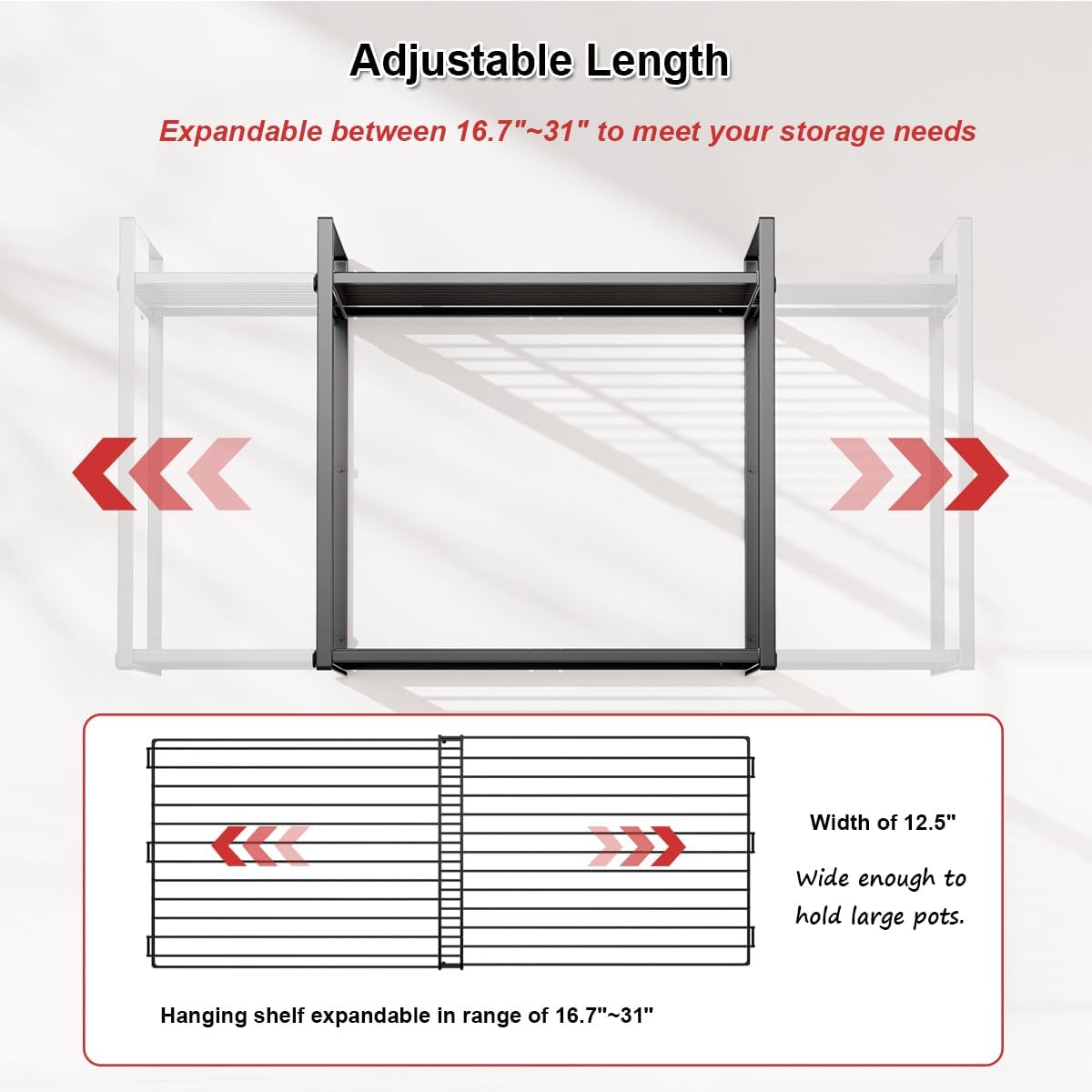 - Expandable Length Pot Rack - This wall mounted pots and pans organizer expands from 16.7" to 31", making it perfect for kitchens of all sizes. Whether you're organizing a small kitchen or looking to free up counter space creatively, this pots and pans organizer offers a flexible solution.