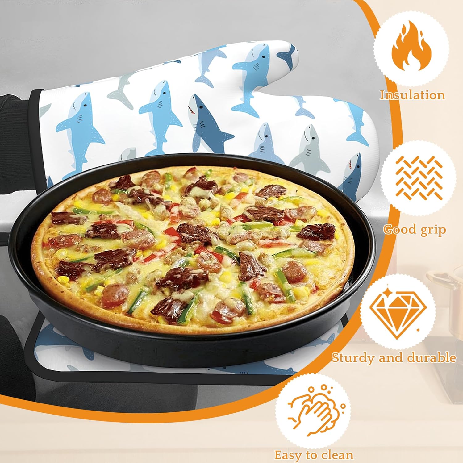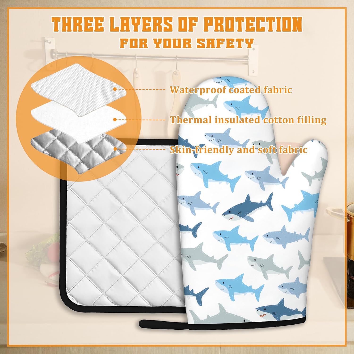 Cute Shark Oven Mitts and Pot Holders Set,Kitchen Decor Heat Resistant Non Slip Hot Pads and Oven Mitt for Chef Cooking Baking BBQ Mom Girl Gifts(4 Piece Set)