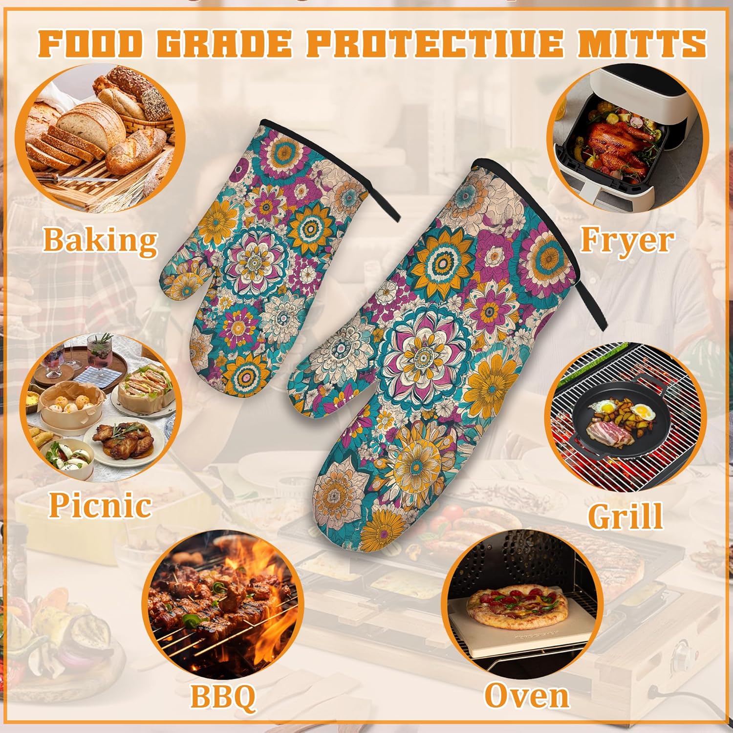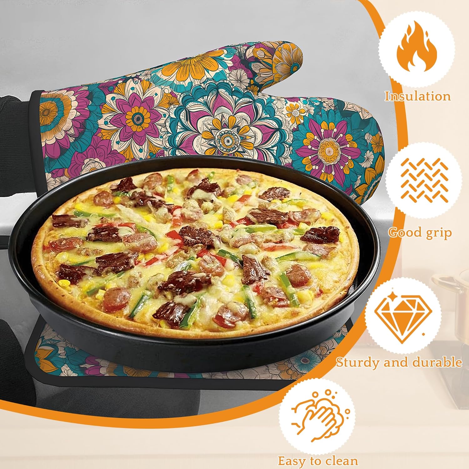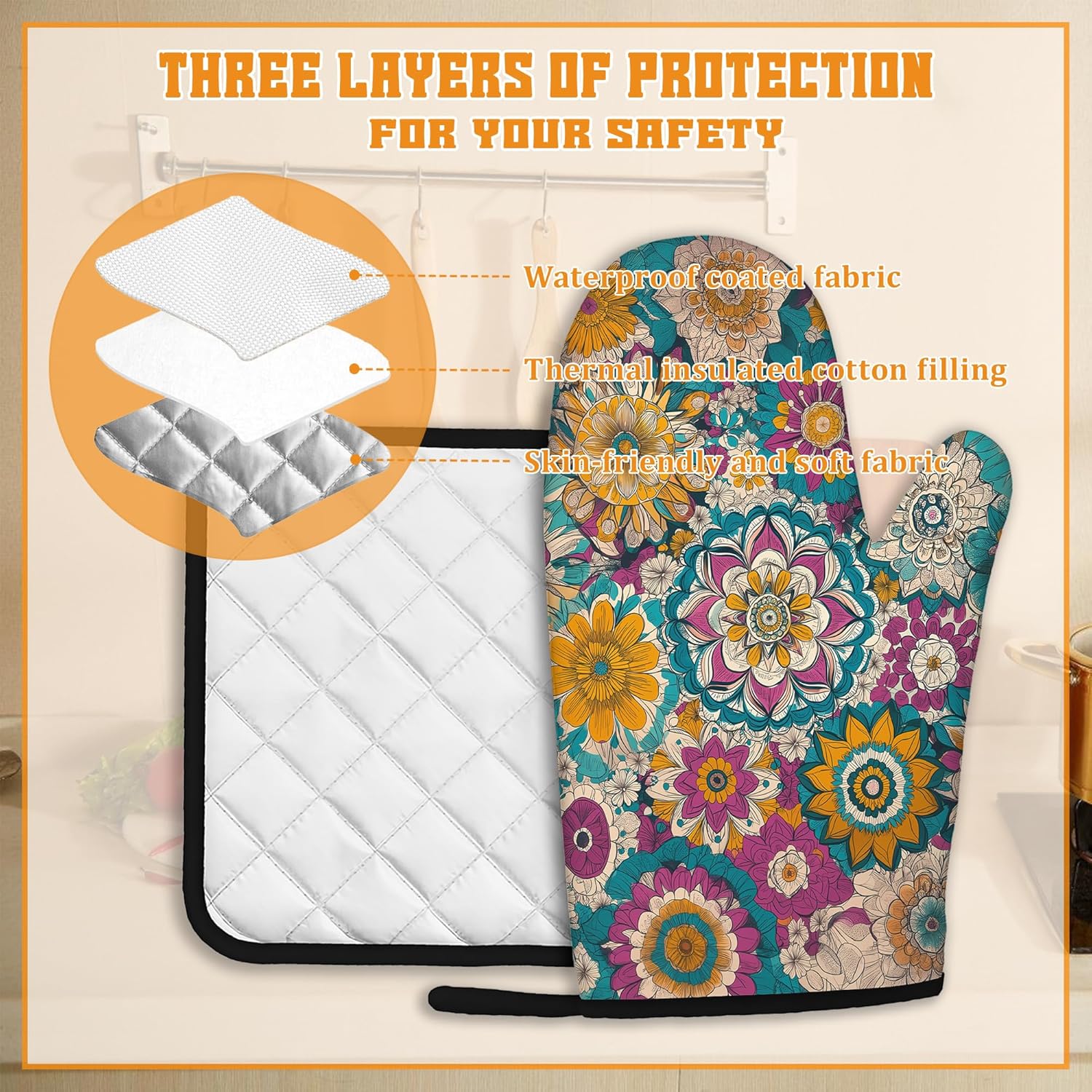 Vintage Mandala Oven Mitts and Pot Holders,Floral Flower Heat Resistant Oven Mitts Gloves and Pot Holder for Home Kitchen Decorations Cooking Baking BBQ Gifts,Set of 4
