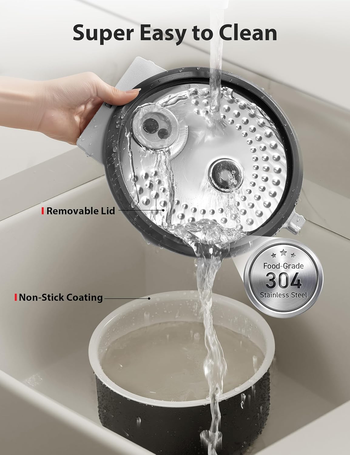 - CONVENIENT MAINTENANCE: Removable steam vent cap and valve for thorough cleaning, with hand-washable non-stick inner pot for lasting performance.