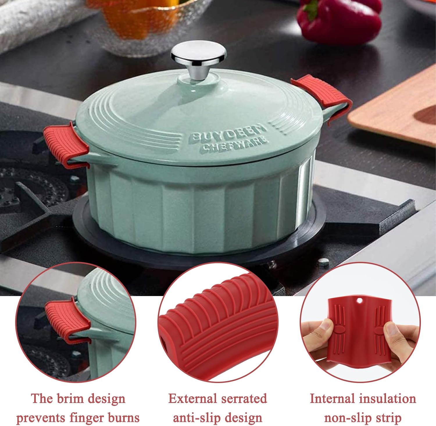 - Heat-Resistant Silicone Material: Made from robust, heat-resistant silicone, these pot handle covers are flexible, durable, and odorless. The silicone handle for cast iron skillet offers dependable heat insulation, reducing burn risks during use. The silicone handles for pots and pans can be reused multiple times, offering long-lasting performance.