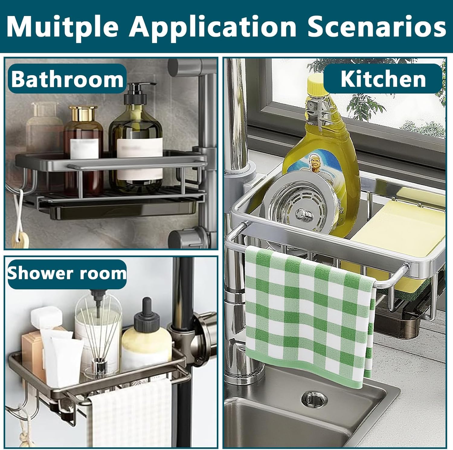 - 🧽【Multifunctional Sink Faucet Organizer】Keep your sponge, scrubber, dish soap, and brush within reach with this over-the-faucet kitchen sink caddy. Ideal for maximizing your sink space.