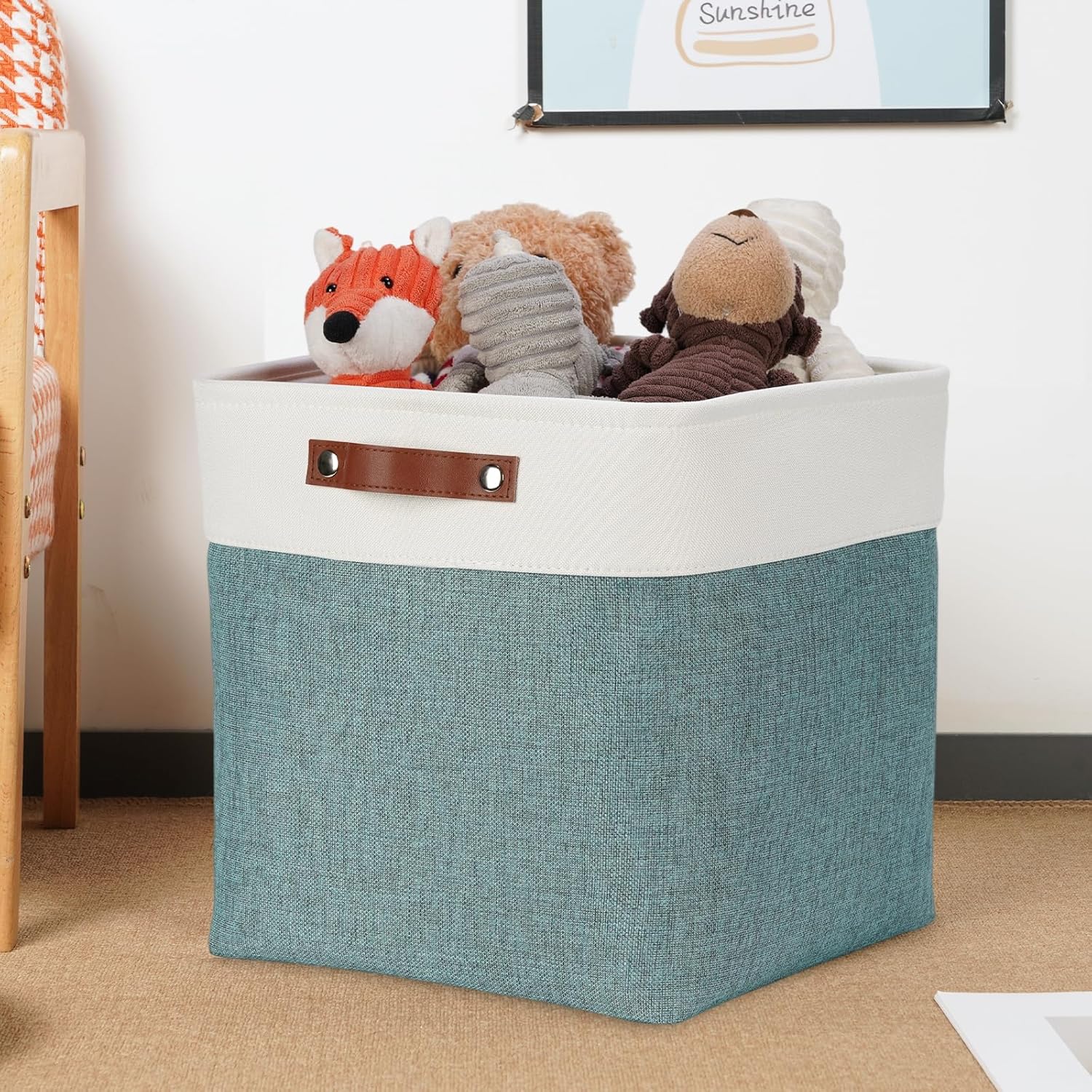 DULLEMELO Storage Bins, 4 Pack Of 13x13x13 Decorative Storage Cube Bins Suit Office, Home, Shelves And Closet, Stackale Gift Baskets Empty with Leather handle (White&Deep Green)