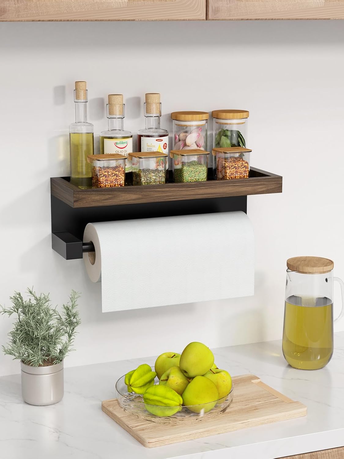 - Practical & Stylish: Crafted with a sturdy metal frame and solid wood shelf, this matte paper towel holder provides extra storage for spices, decor, or essentials while adding modern and farmhouse charm to your kitchen, bathroom, or RVs camper decor.