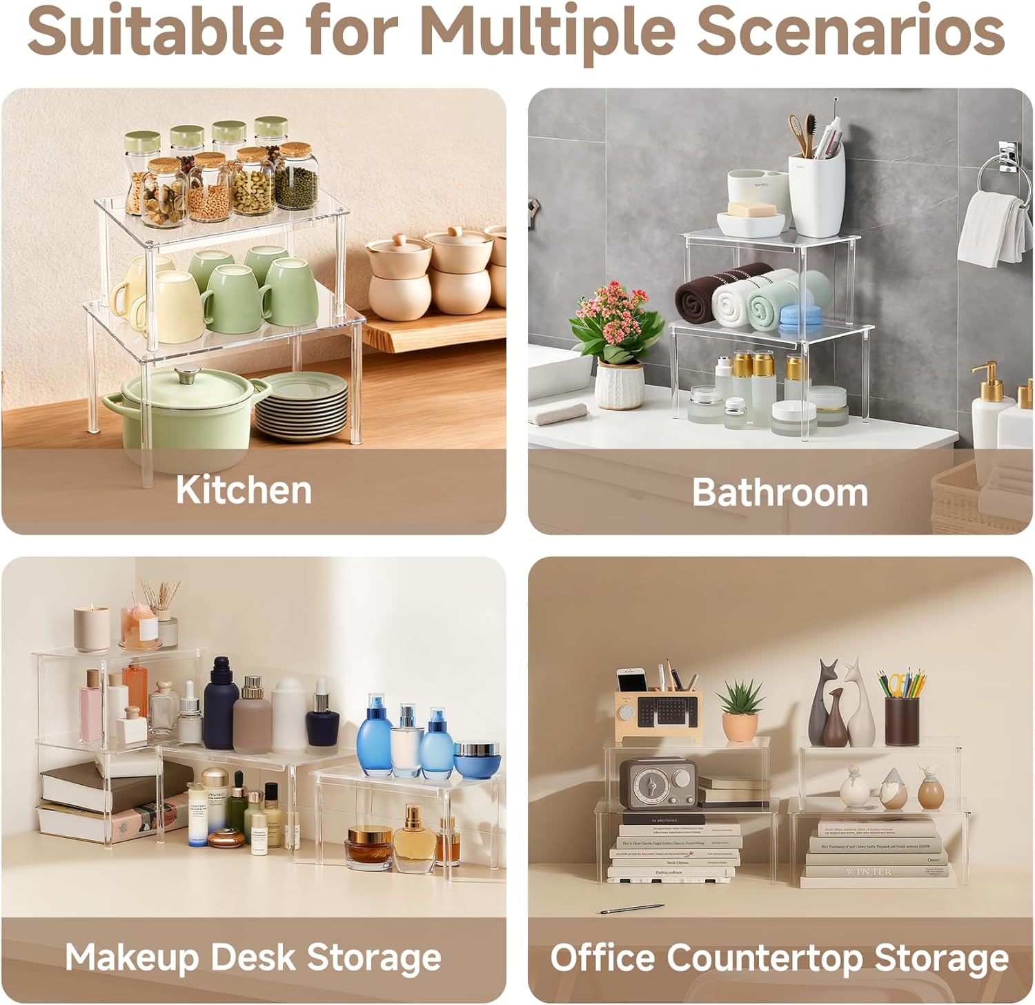Clear Kitchen Cabinet Organizer, Set of 4 Stackable Spice Rack, Acrylic Shelves for Pantry Organizers and Storage, Tiered Spice Organization for Cabinet, Shelf Organizer for Desk Countertop