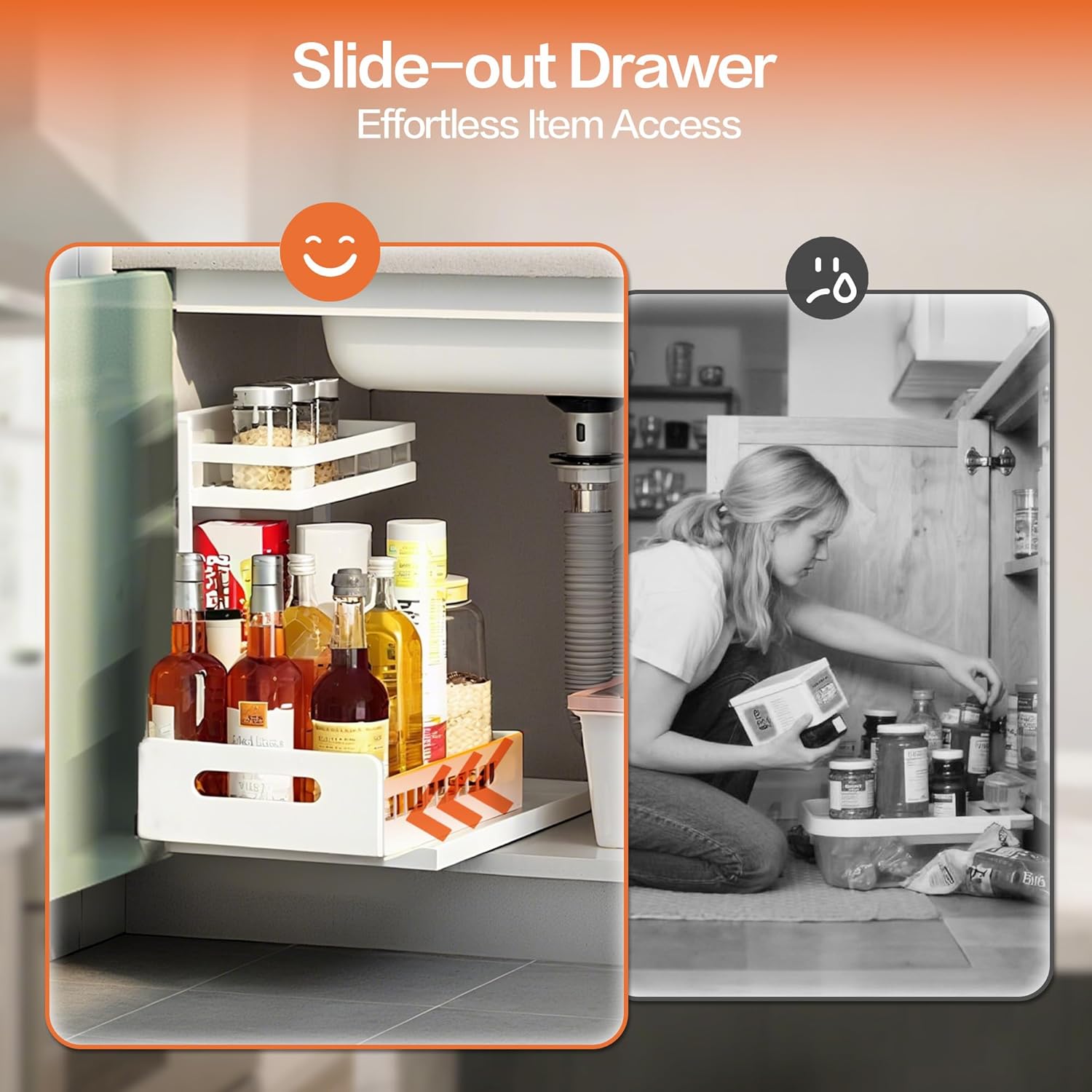 - 【Multi-use Under Cabinet Storage】This bathroom cabinet organizer is super versatile. It works not only great as kitchen storage organization, but also shines just as well in bathrooms, laundry rooms, and more. Whether you’re storing cleaning supplies, skincare products, or spices, it handles it all with ease—boosting your daily convenience and value, and provide valid under sink organization and storage.
