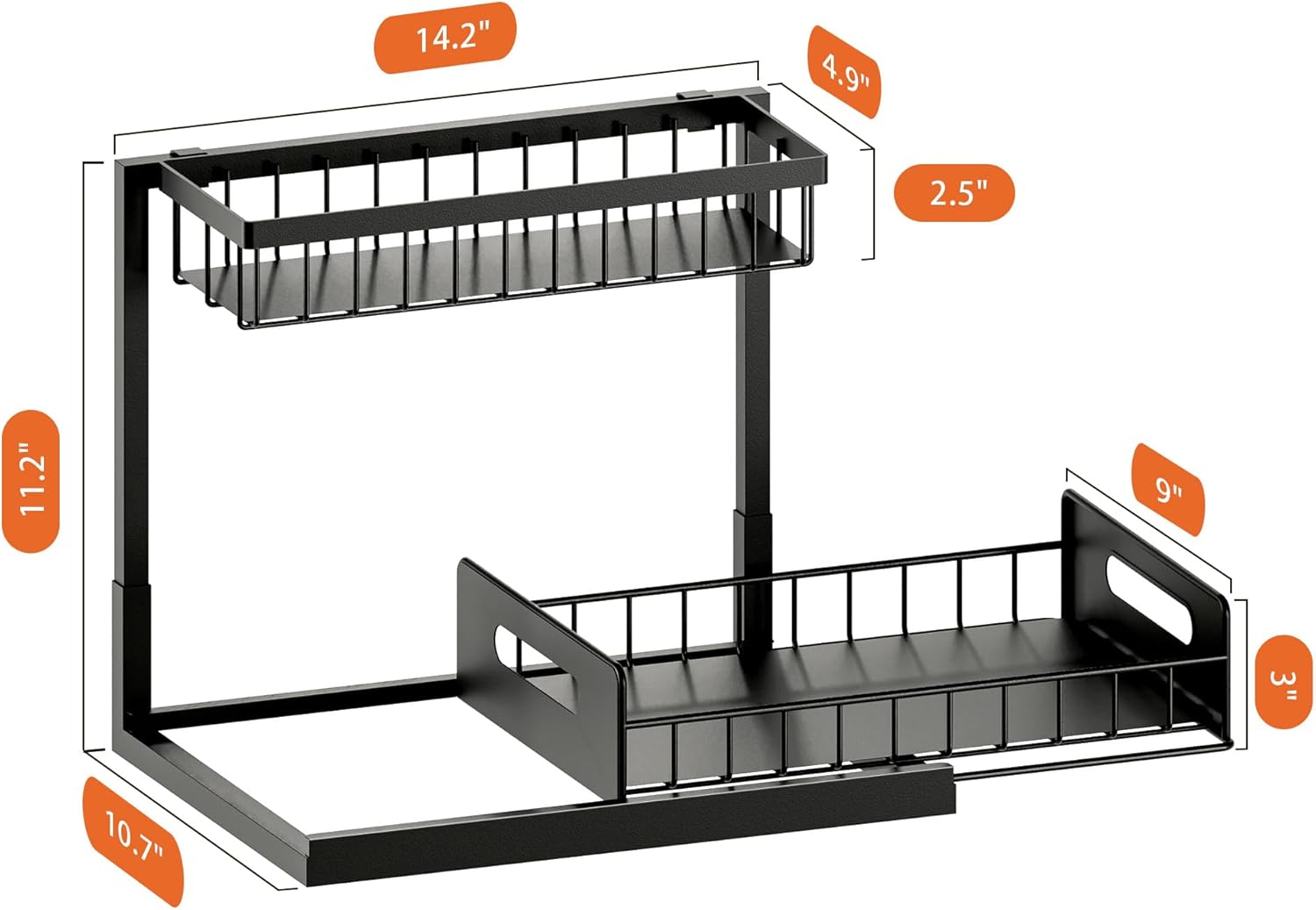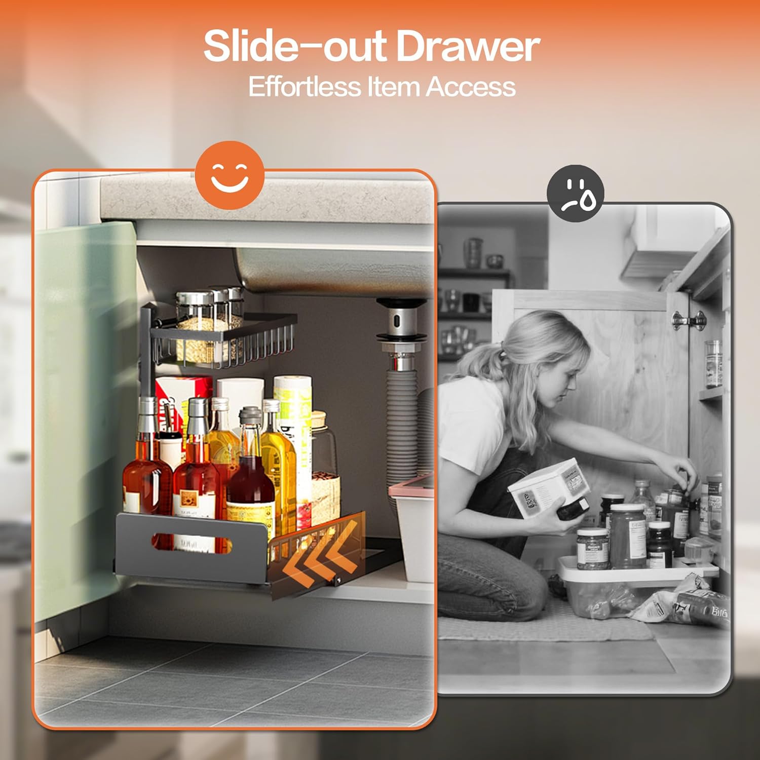 - 【Pull Out Cabinet Organizer】Give our 2 tier bathroom organizer a try. The lower sliding basket paired with upgraded rails and glides smoothly. No more bending and digging for items in the back; accessing your stuff is easy and effortless.
