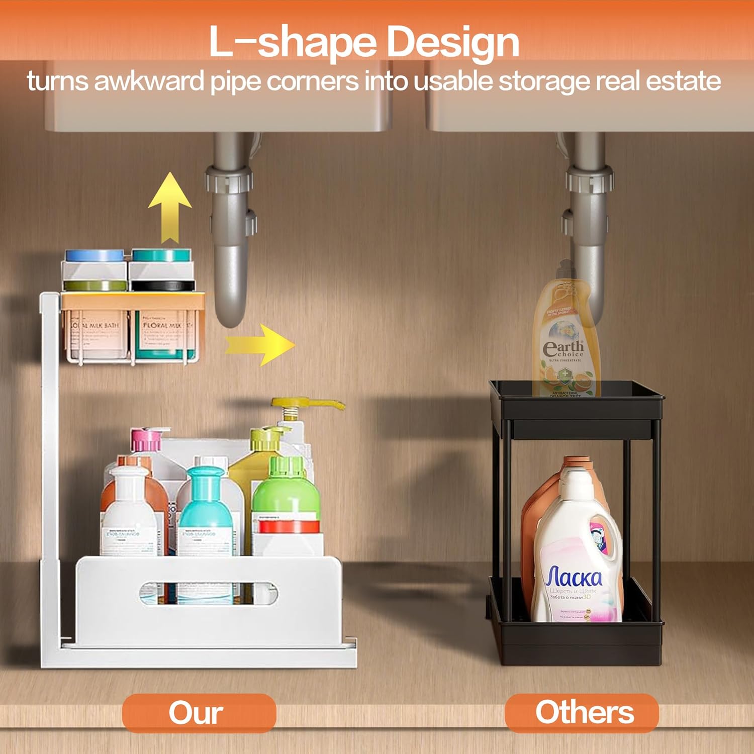 - 【L-Shaped Design】Tired of struggling with the cluttered space under your sink? This under sink organizer features a unique L-shaped design that skillfully works around pipes, freeing up more vertical space,provide more under sink storage. Just like a cabinet organizer focuses on efficient storage, ours leaves room for tall bottles—tackling that cabinet mess and keeping things neater and more organized.