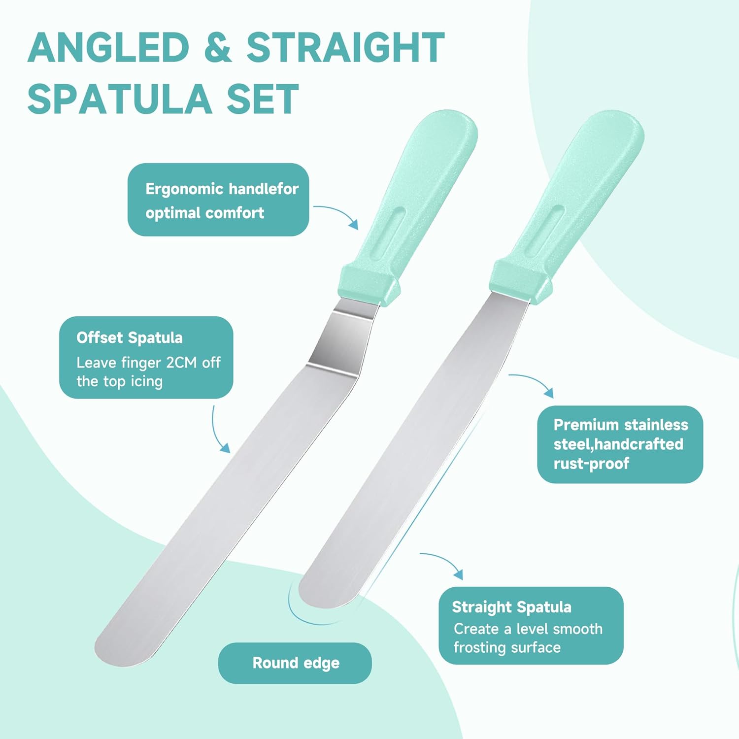 - Straight and Angled Frosting Spatulas: These high-quality stainless steel frosting spatulas make it easy to even out frosting and work on layered cakes. With a 12.5-inch angled spatula and a 10.6-inch straight spatula, you can create even crumb layers and perfect surfaces.3 Edges of Cake Scrapers: This cake decorating set includes 3 different icing comb scrapers, so you can make various designs on your cake. With one rounded scraper, one straight scraper, and one toothed scraper.