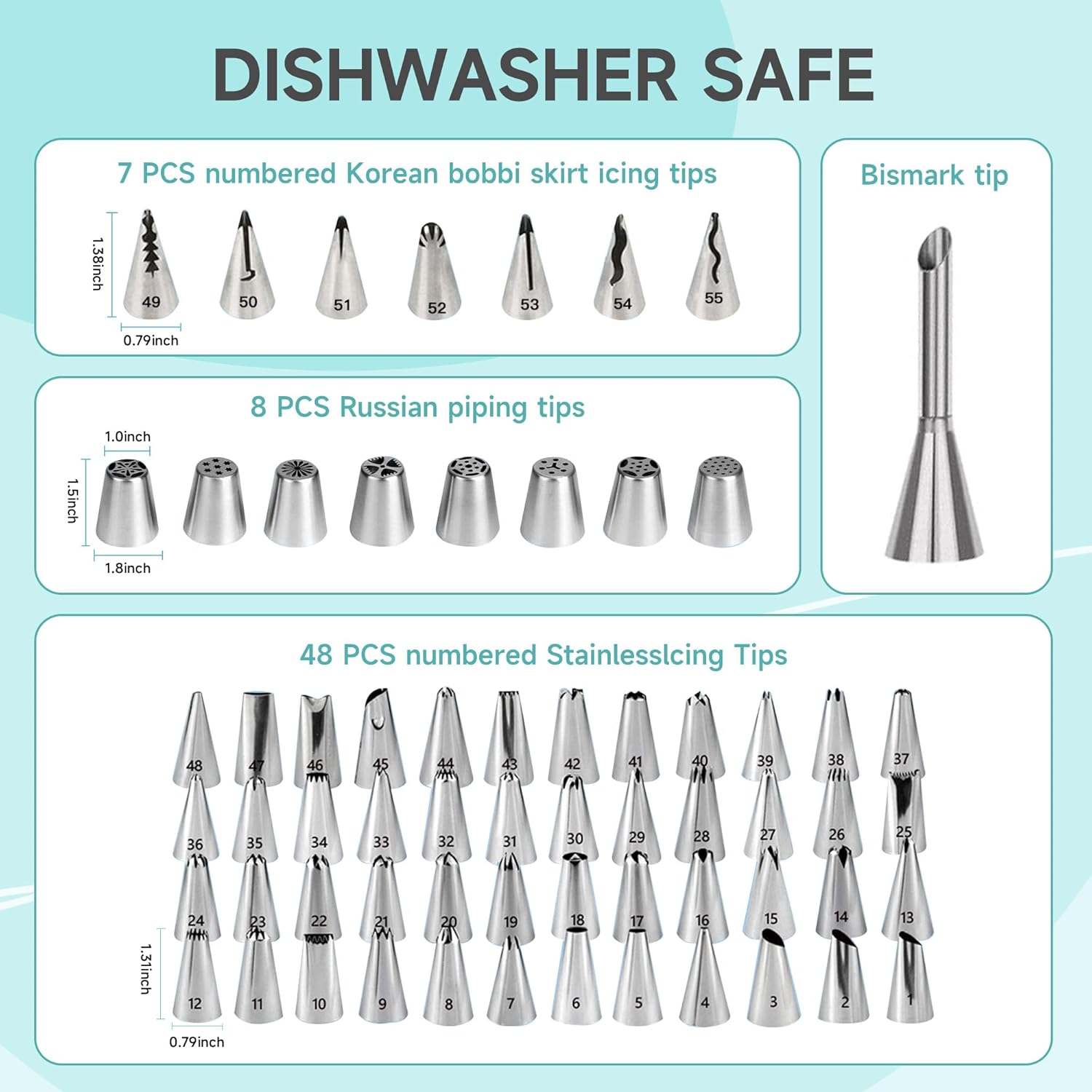 - Convenient Cake Decorating Supply Kit : This is FUN FOR ALL AGES AND SKILL LEVELS,This set having numbered piping tips with Pattern chart. So you don't have to worry about which tips produce what kind of decoration, just have a look on pattern chart where we have provided outcome of each tip to make tip selection,E-Book user guide includes The Cake Decorating supplies four levels,Each step Method of Cake Baking, Leveling & icing cakes, 3 frosting recipes, Step by step guide for using icing.