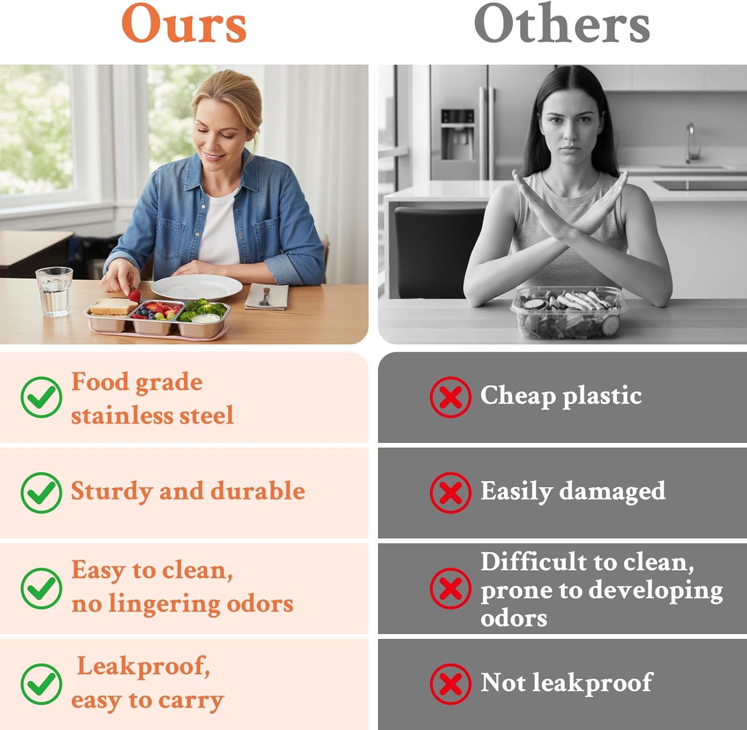 - 3-in-1 Stainless Steel Snack Containers: The 3 compartment design lets you carry a greater variety of fruits and foods at once, making it easier to maintain a balanced diet. The food-grade silicone lids provide an airtight, leak-proof seal to keep contents fresh, ensuring worry-free transport.