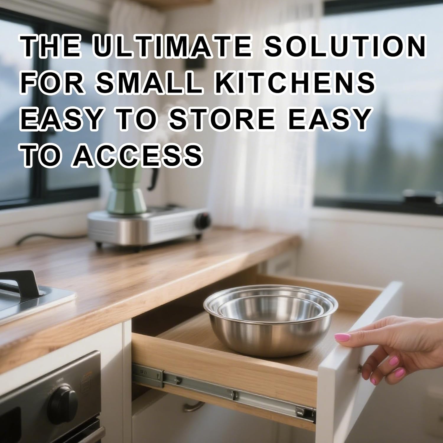 - [MAXIMIZE SPACE: ULTRA-COMPACT NESTING DESIGN] These mixing bowls stack seamlessly into a single unit (just 3.15" tall!), saving 70% cabinet space β perfect for cramped kitchens, apartments, RVs, or dorm rooms. Free up room for other essentials without sacrificing a full mixing set