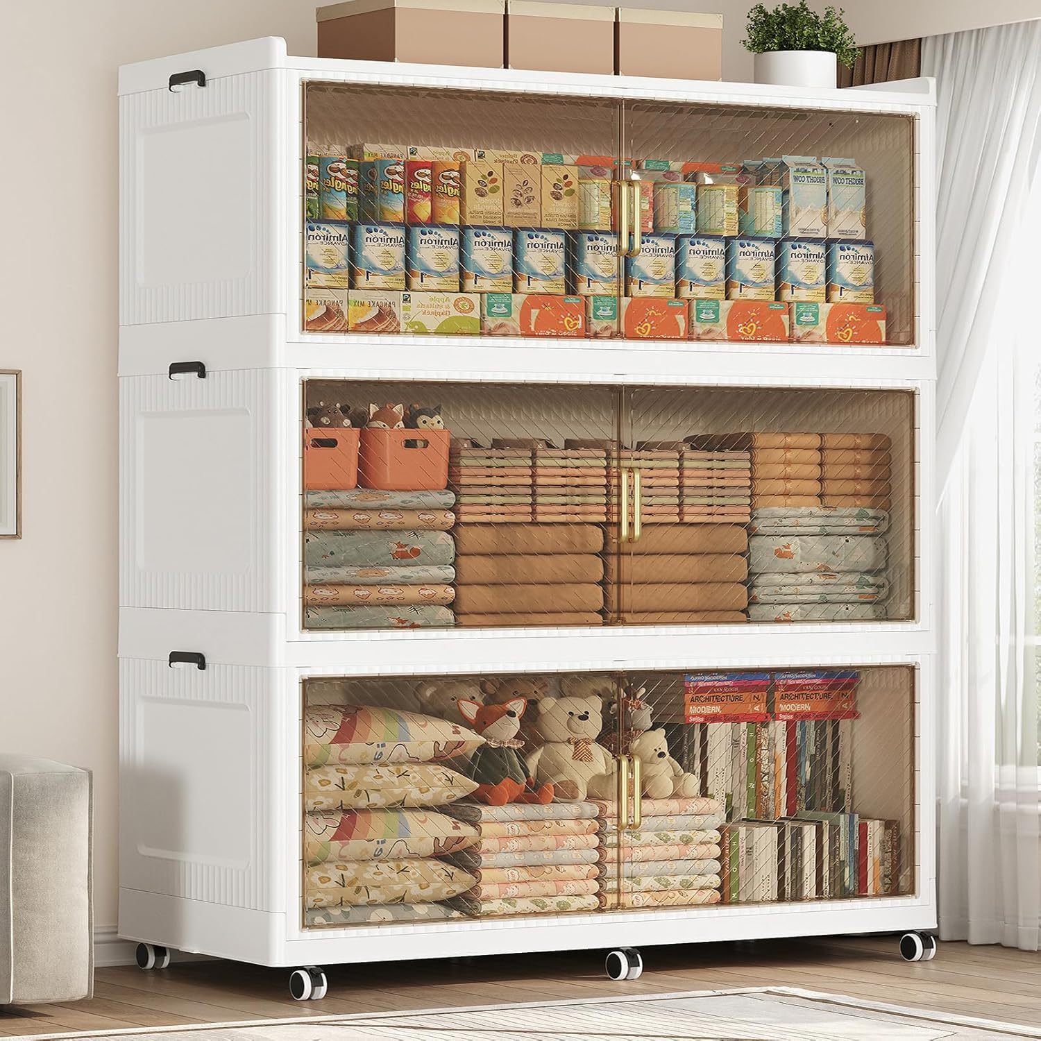 - 【Two Ways to Open & Magnetic Doors】The collapsible storage bins with lids and wheels feature a dual access way, allowing for both top and front door openings, and with clear brown windows for easy visibility. The super huge storage bins with open front doors are equipped with magnetic lock buckles to prevent dust from entering the cabinet.