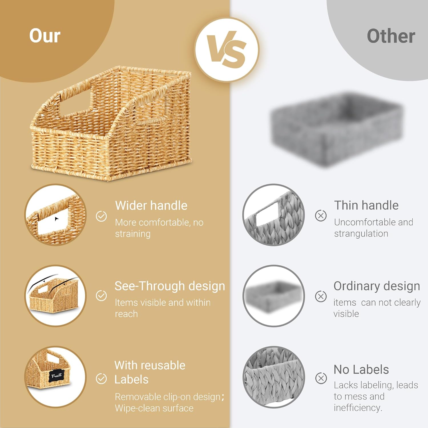 Wicker Baskets for Organizing,Pantry, Kitchen Counter with Handles, Handwoven Woven Storage Baskets for Fruit, Bread, Vegetable, Waterproof Plastic Storage Bins for Shelves, 3 Pack, Natural