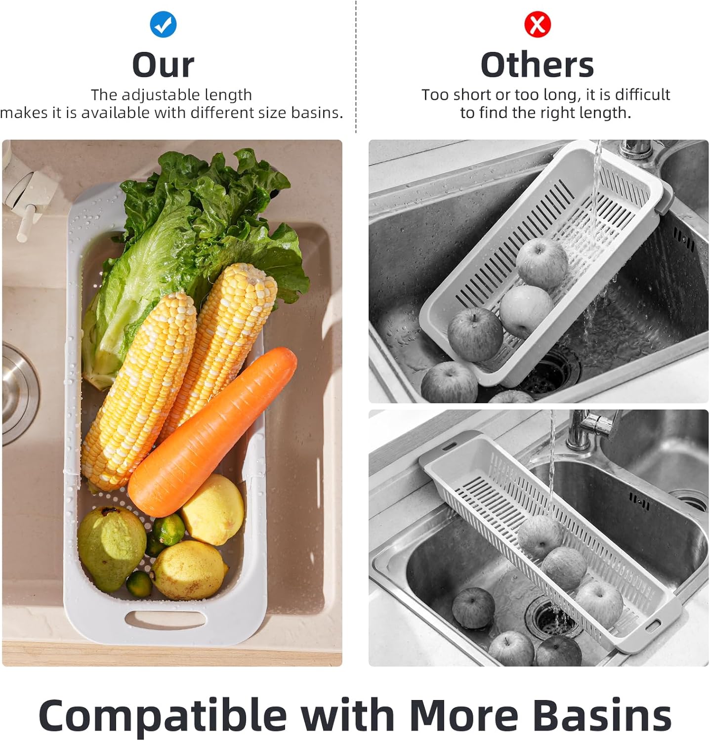 Extended Long Over the Sink Colander, Wash Vegetables Fruits Collapsible Colander Strainer, 14.5"-19.3" Extendable Kitchen Sink Accessories for Dishes Drying, Vegetable Basket, with Peeler