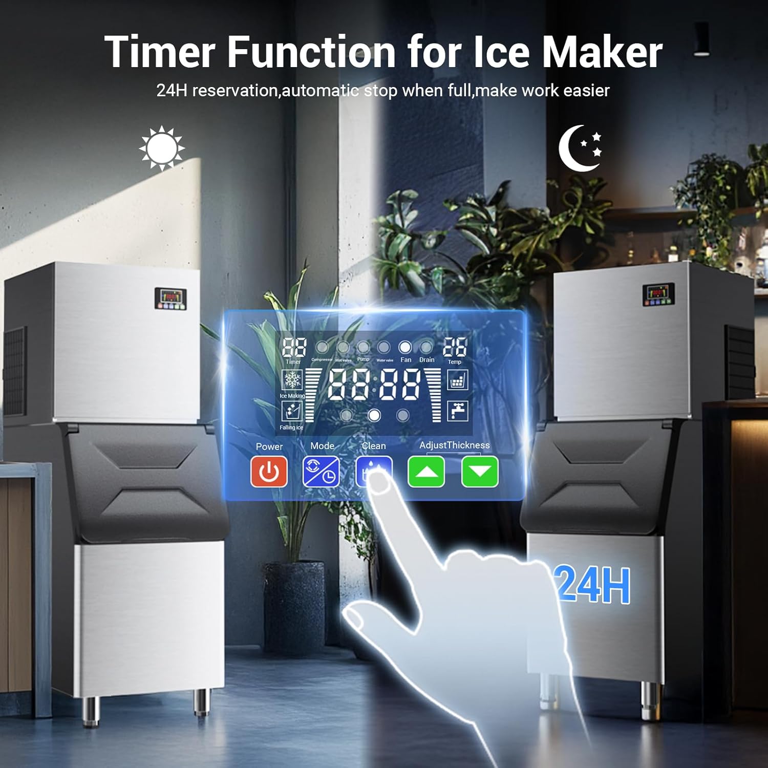 - Intuitive Controls for Effortless Operation: Designed for simplicity, this ice maker features a user-friendly LCD display and 5-button control panel, offering one-touch power, auto/manual de-icing and cleaning modes, a programmable timer (hold to schedule start/shutdown), and 30 adjustable ice thickness settings—all for seamless, hassle-free operation.