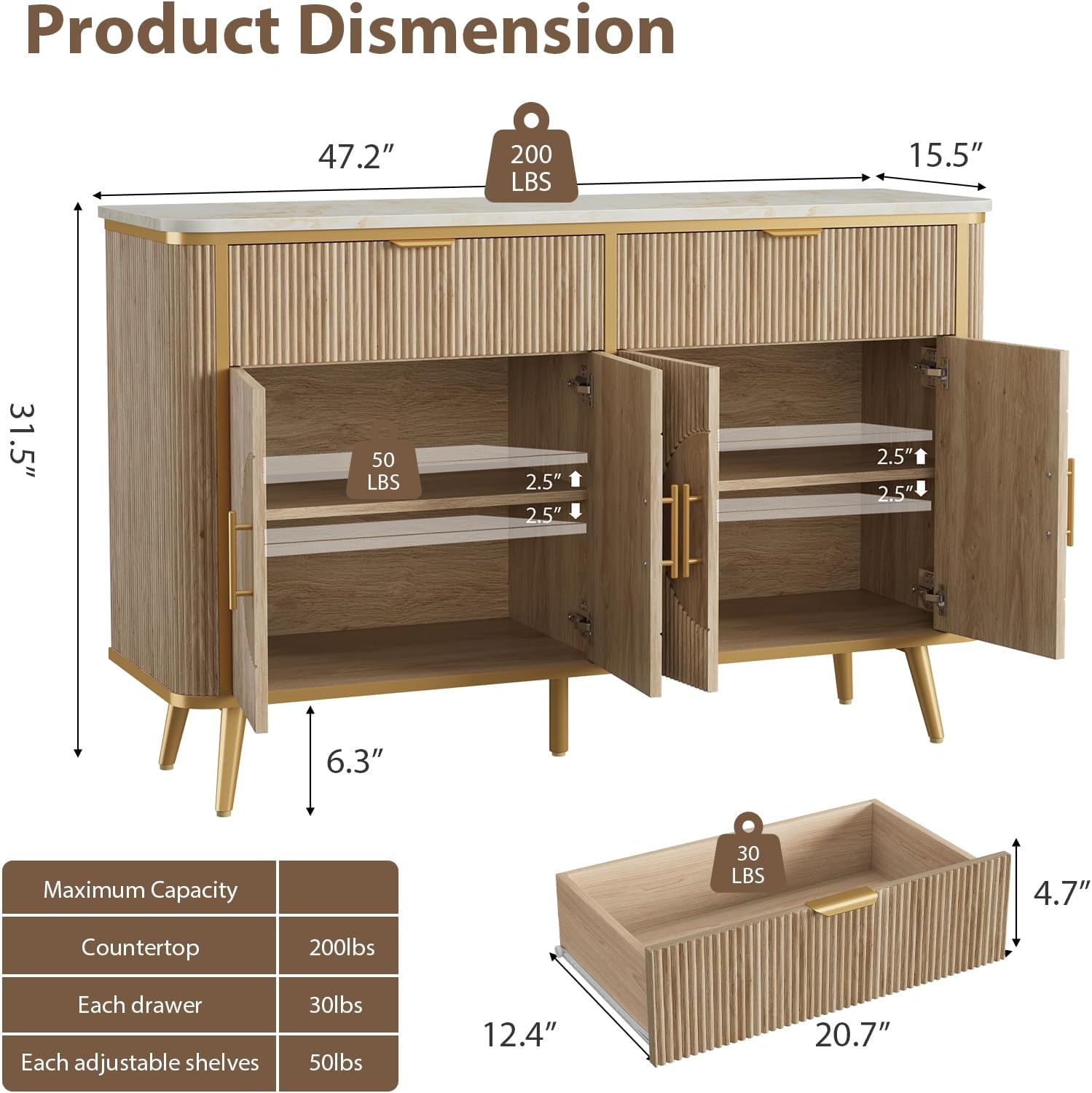 - Durable & Stable construction—Adapting solid high-grade engineered materials, the buffet sideboard cabinet can safely support up to 200 lbs, ensuring your belongings are stored securely. The countertop is scratch-resistant and waterproof, effortlessly withstanding daily wear and stains. Additionally, the reinforced splayed legs provide ample space for the robot vacuum to clean, helping your room stay clean and tidy daily!