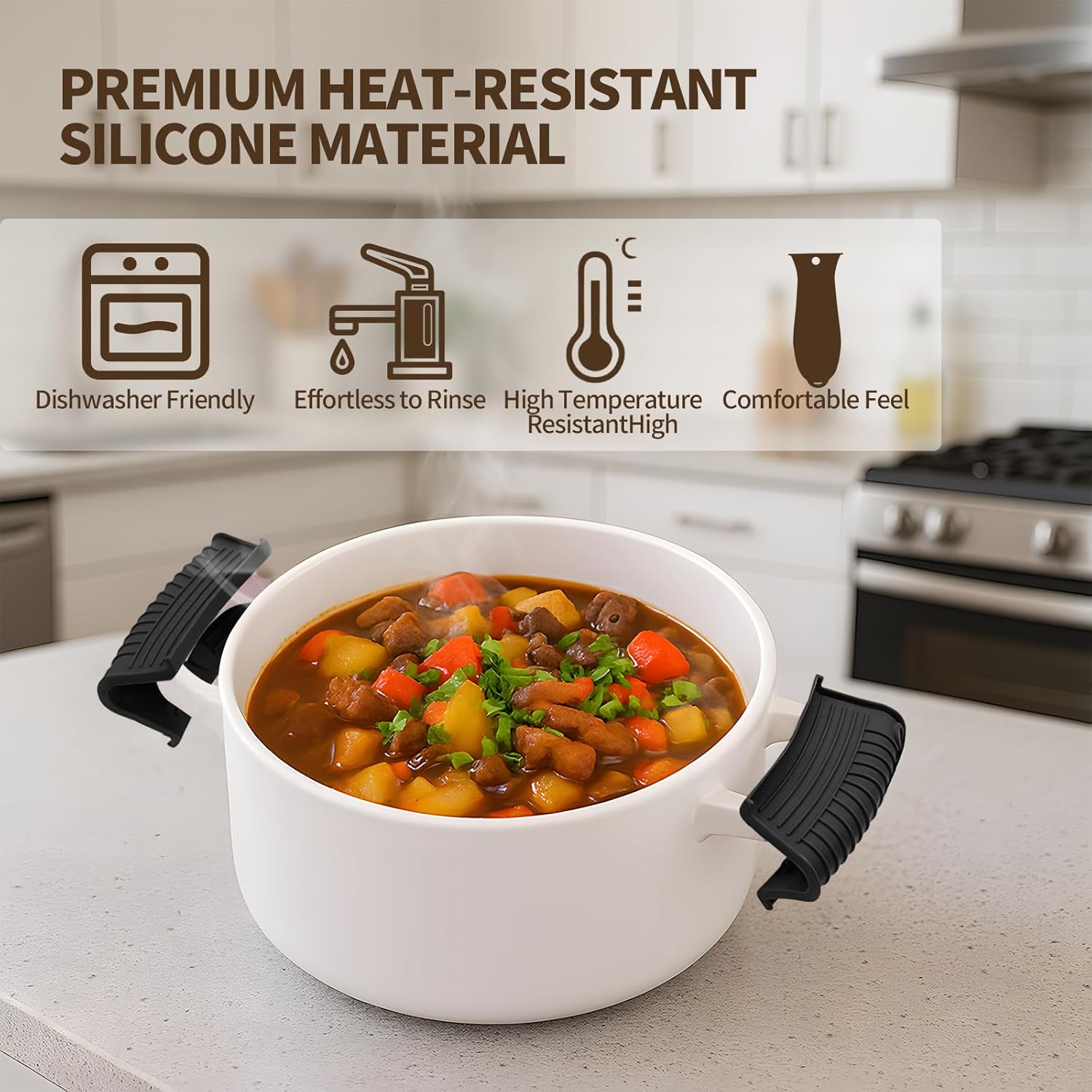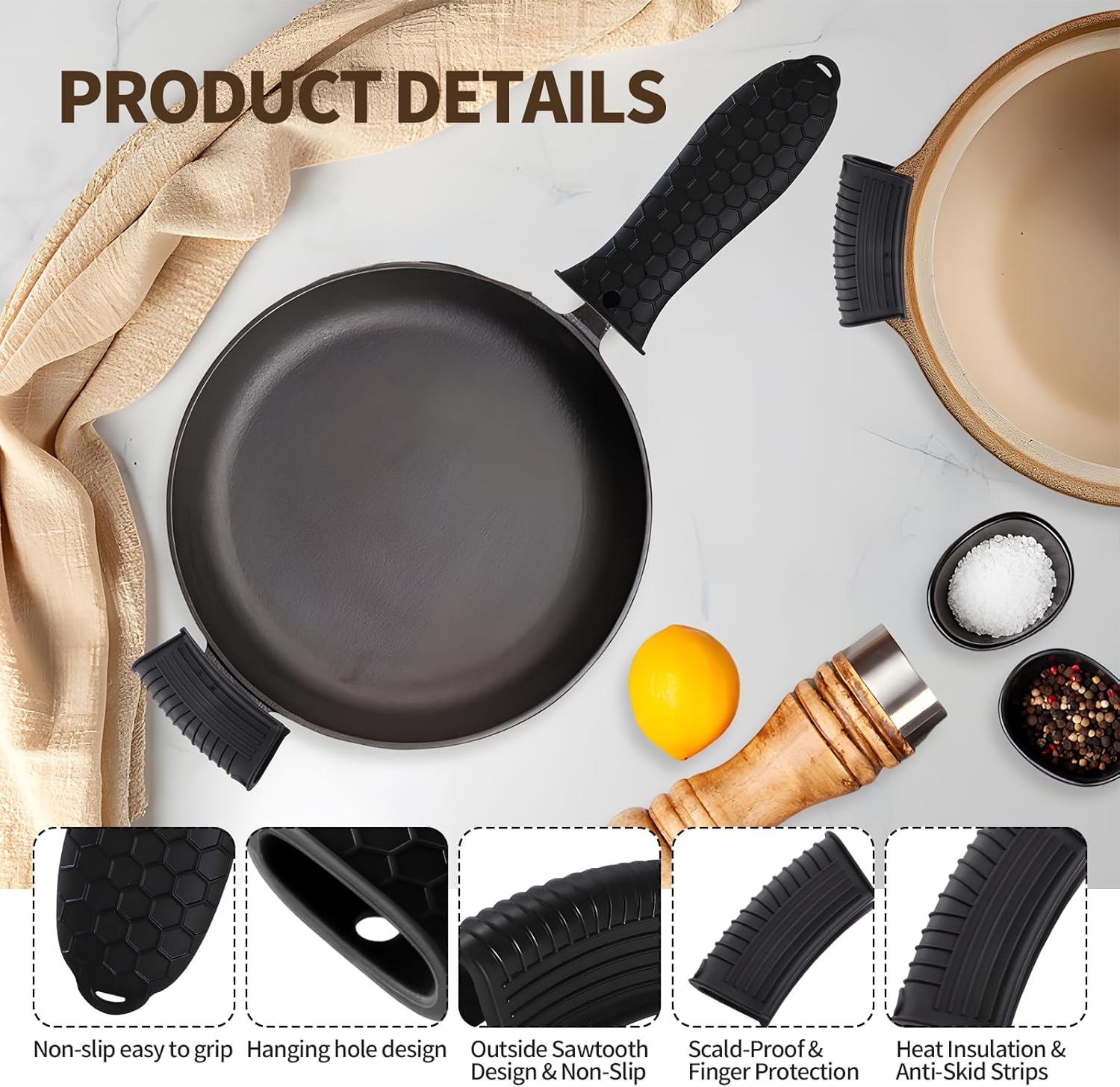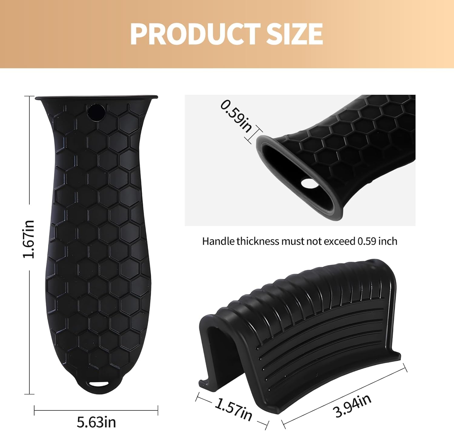 - Anti-Slip Safety Grip: Features honeycomb texture on the surface and internal silicone ribs for enhanced friction, ensuring a secure grip. Ergonomic design fits snugly on handles, providing stability when moving heavy, hot cookware.