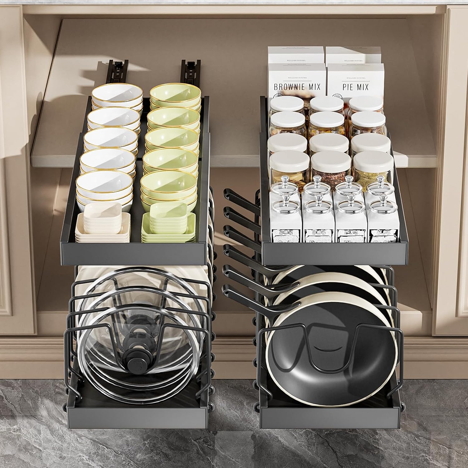 - Smooth Pull-Out Convenience ββ Transform cluttered cabinets into functional storage with this pot and pan organizer, designed like sliding drawers for effortless access to pots, pans, and kitchen tools. The smooth-gliding rails ensure quiet, jam-free operation, maximizing under-cabinet space efficiency
