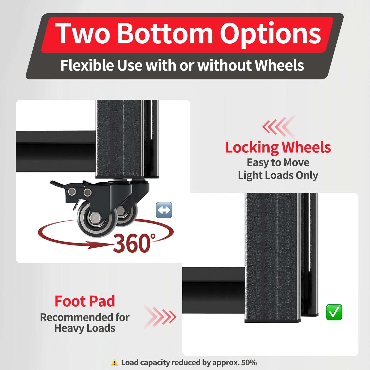 - Detachable Wheels for Flexibility: The wheels make the shelving unit portable. However, installing the wheels reduces the weight capacity by 50%(1000lbs). For heavy-duty storage, it’s recommended to use the unit without wheels for maximum load capacity