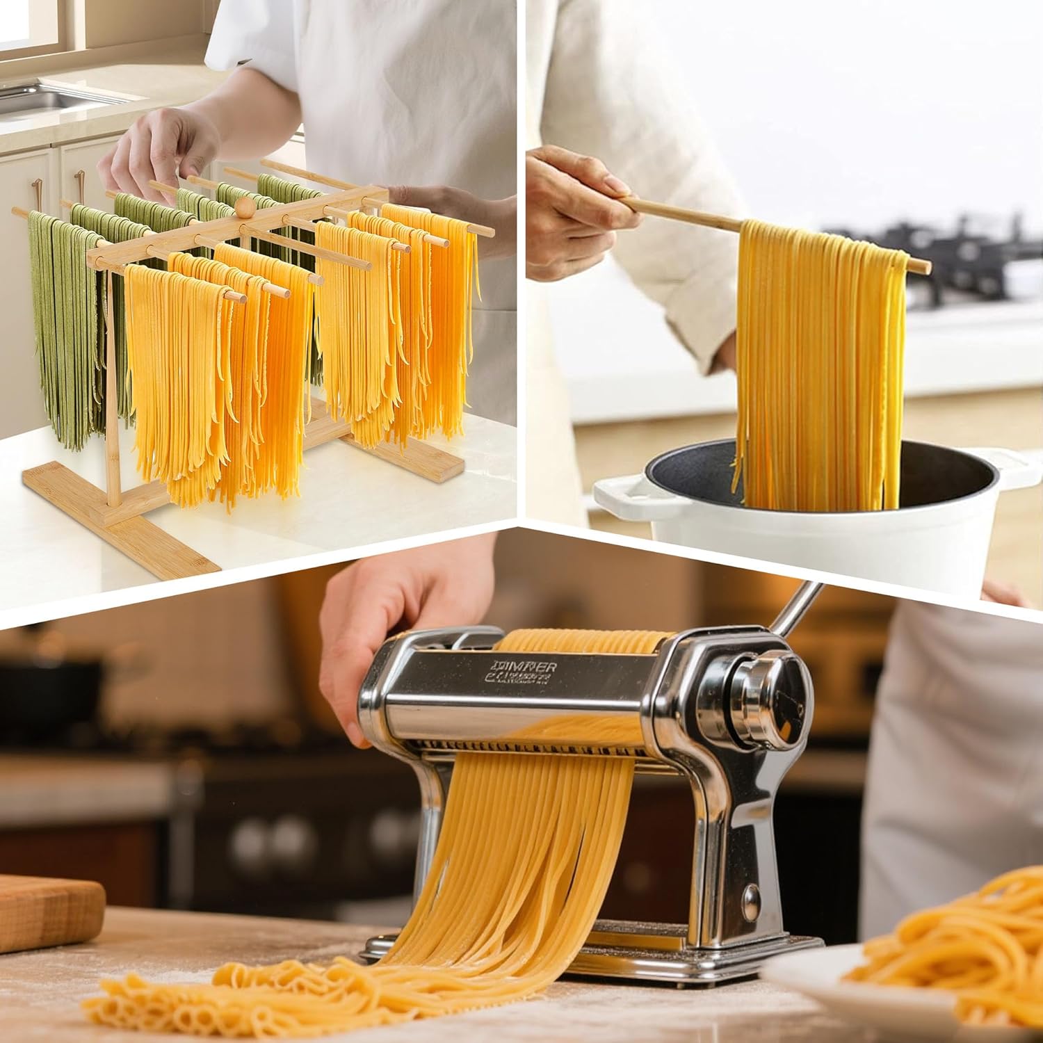 CycForge Bamboo Pasta Drying Rack with 14 Rods & Transfer Wand - Large Capacity Collapsible Stand for Fresh Homemade Spaghetti, Foldable Space Saving Storage