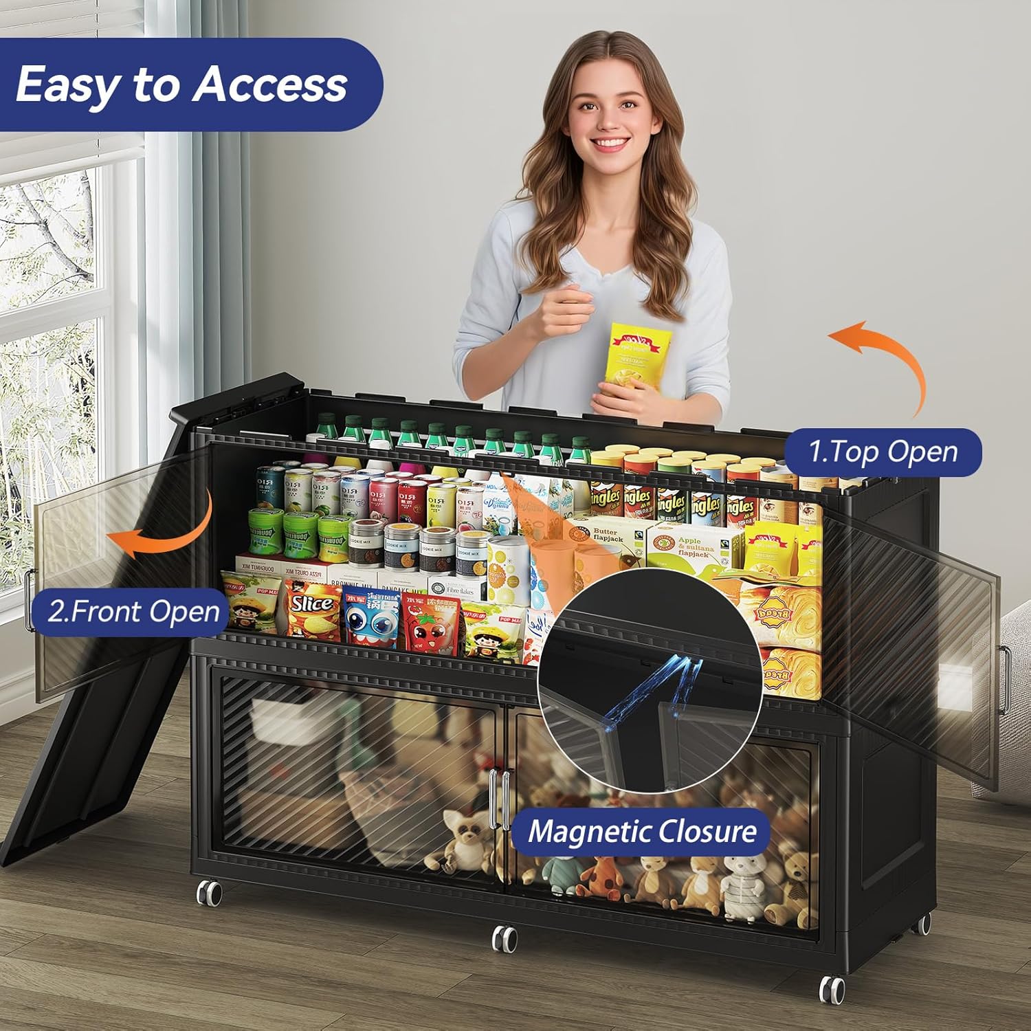 - 【Two Ways to Open & Magnetic Doors】The collapsible storage bins with lids and wheels feature a dual access way, allowing for both top and front door openings, and with clear brown windows for easy visibility. The super huge storage bins with open front doors are equipped with magnetic lock buckles to prevent dust from entering the cabinet.