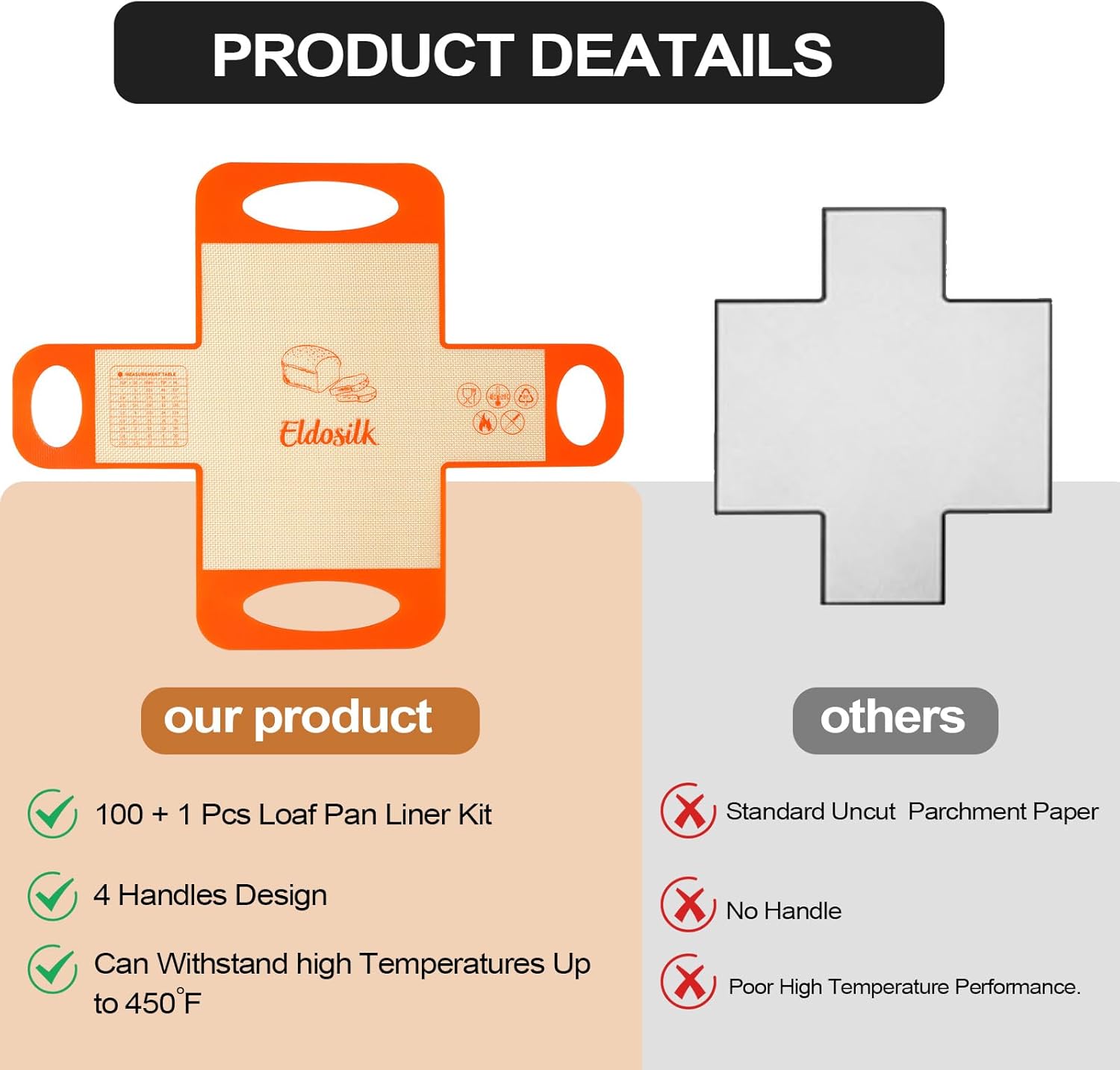 - 【Loaf Pan Liner Kit with 100+1 Pieces】Get everything you need for perfect bread: 100 unbleached parchment paper liners for disposable convenience and 1 reusable silicone sling for eco-friendly baking. Designed to fit standard 9x5 inch or 1.5 lb loaf pans — no trimming needed. (Pan not included).