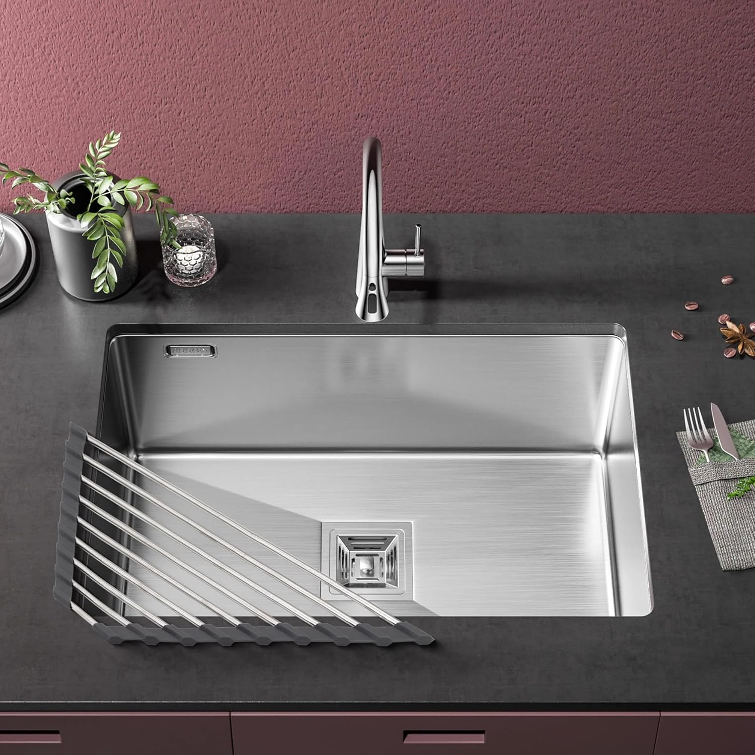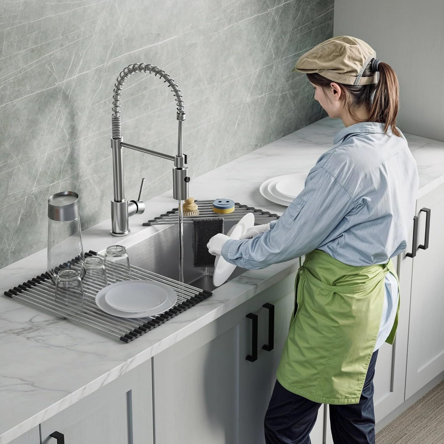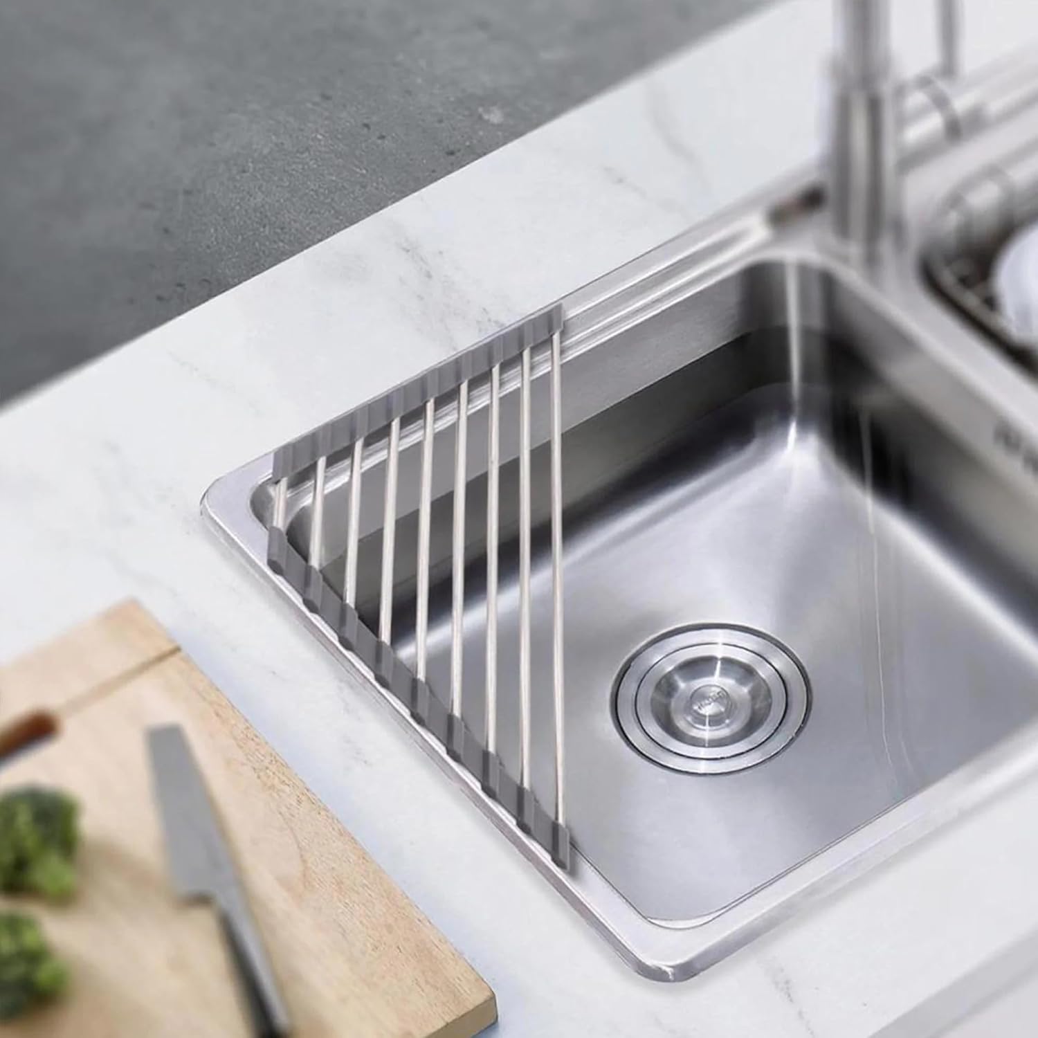 - Fits on Any Surface & Stylish Looks: Stretches securely over sinks or flat countertops. Sleek stainless steel combined with silicone ends delivers a modern look that blends seamlessly with any kitchen décor.