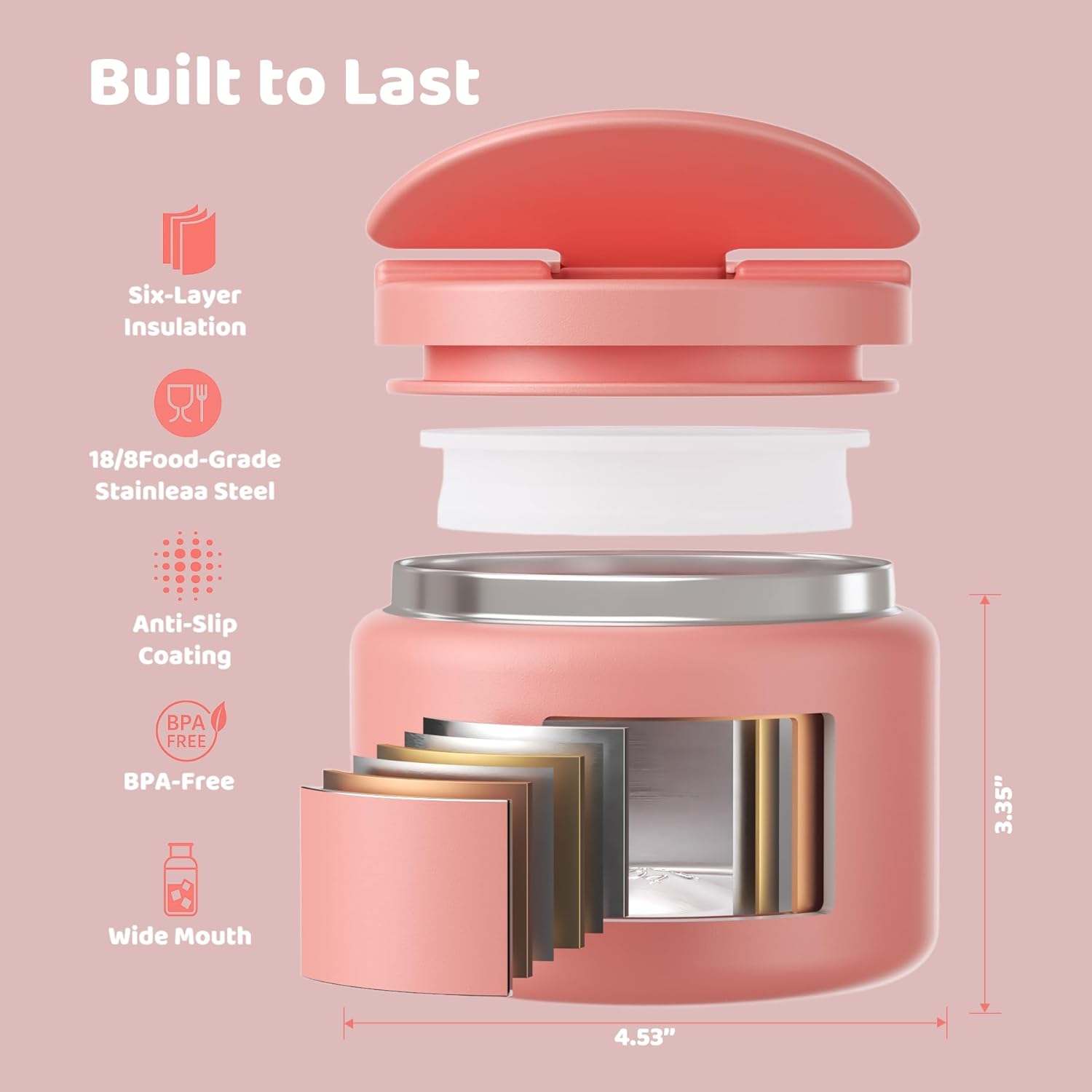 - [ Vacuum Insulated ]: The whole thermo made of 18/8 Stainless Steel with vacuum insulation. Keep your food hot/cold for 6-12 hours. Enjoy your warm meal on the go!